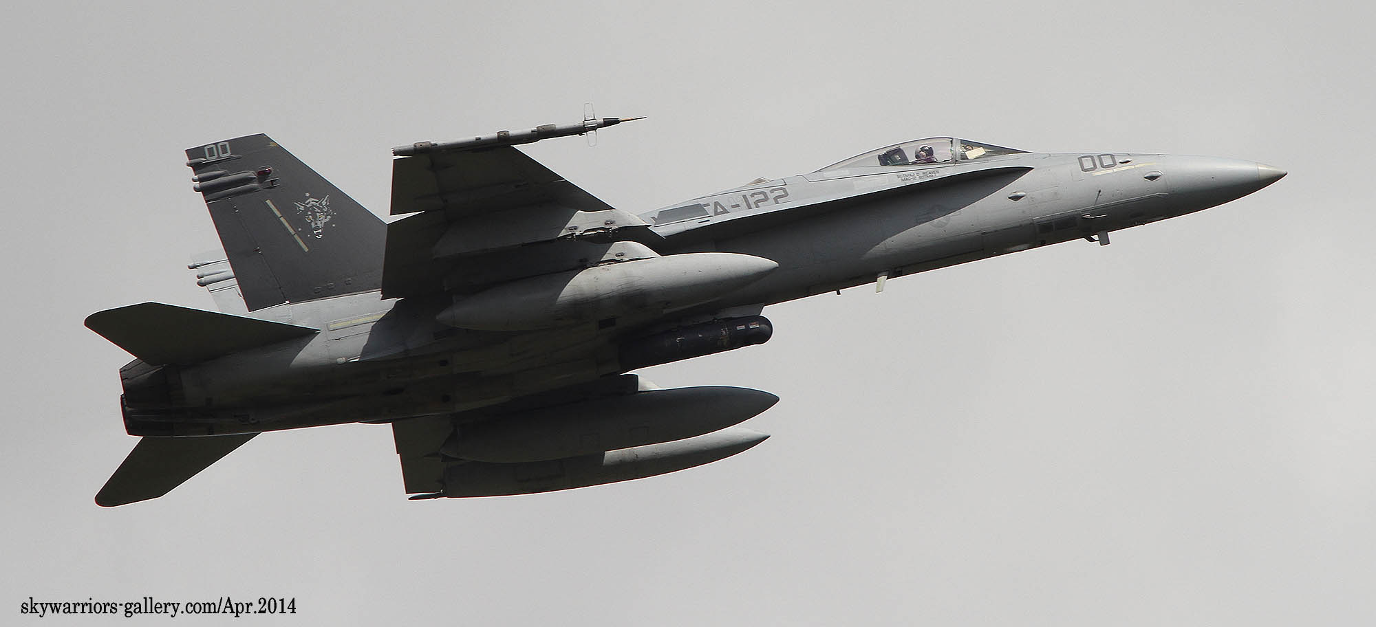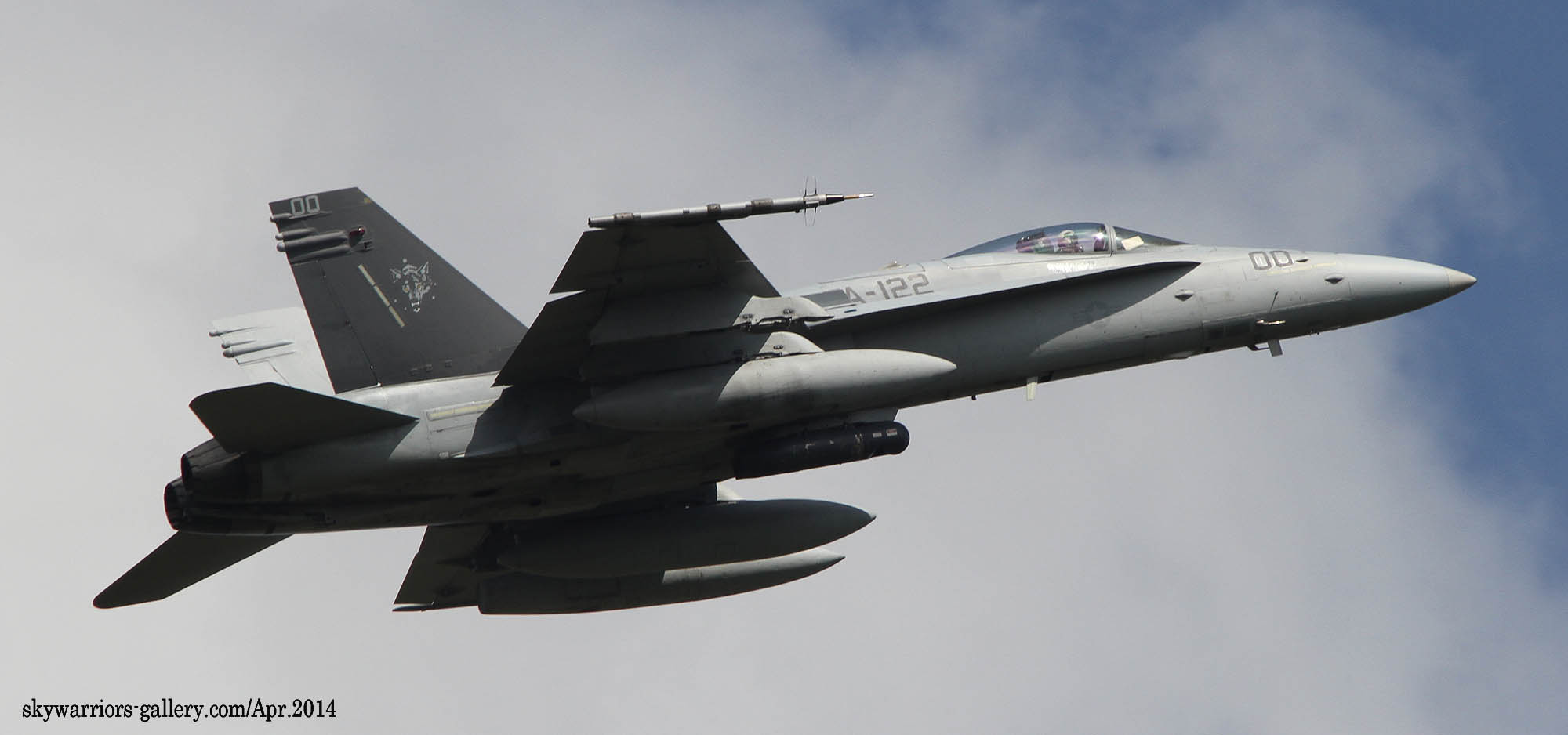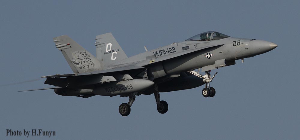 ↑ 狼男のマーキングから再び「十字軍」に変えようとする動きが部隊内にあったようだが、軍の規制で宗教色の強い部隊名は禁止となっており、2014年普通の狼に変更されたのがこのマーキングである。狼のデザインは見事ではあるが、何せ遠目で何が書かれているのか、さっぱりわからない。予想通りあまり長く使われなかった。尾翼内側は、白レター「DC」に紺色の”MACH ALTUS” の文字。VMFA-122 F/A-18C Bu.No.164261