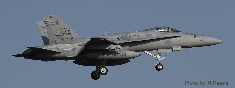 1942年当時 ”酒瓶に乗った只の飲んだくれの狼野郎”だったVMFA-122が 1957年には、恰好良い”十字軍”に変身して永いこと我々を騙くらかしていた?のだ。所が2008年化けの皮が破れて、元の”狼”に戻ってしまった。でも普通のオオカミに戻るのではつまらん!と考えたのか、オカルト風狼を装って狼男に変身できるぞと人を脅かそうとした。しかし、その皮もまた剥げ落ちて最近は只の狼に逆戻りである。我々航空機マニアは、七変化をしてくれるこの部隊のインシグニアとマーキングが嬉しいが、それだけに変身した機会に撮り逃がした悔しさも残るのであった。どうやら2012年にもう一度”十字軍”に変身しようと試みたらしいが、宗教関係団体からの圧力による内部法規で再び変身することが出来なくなったようだ。もう 狼の姿のままで良いじゃないの!