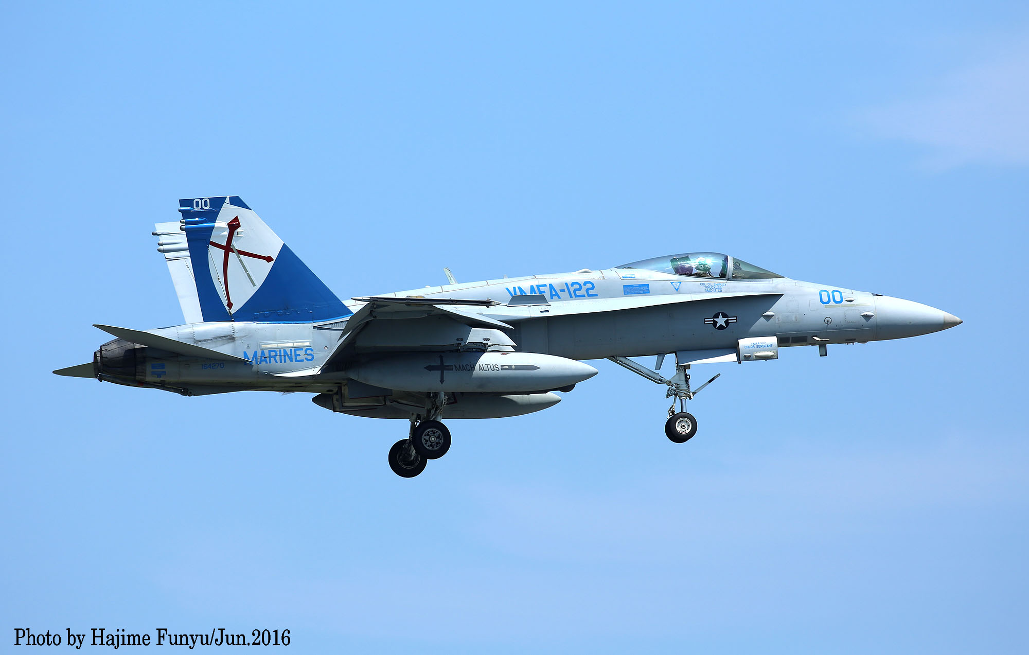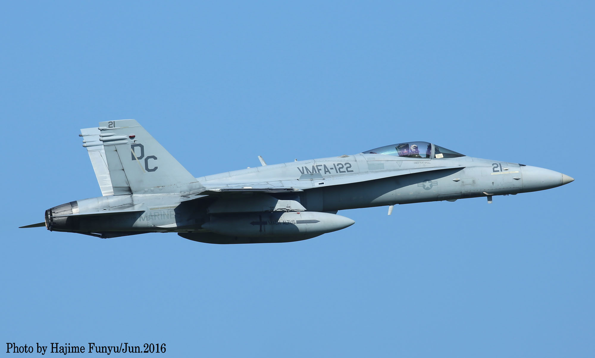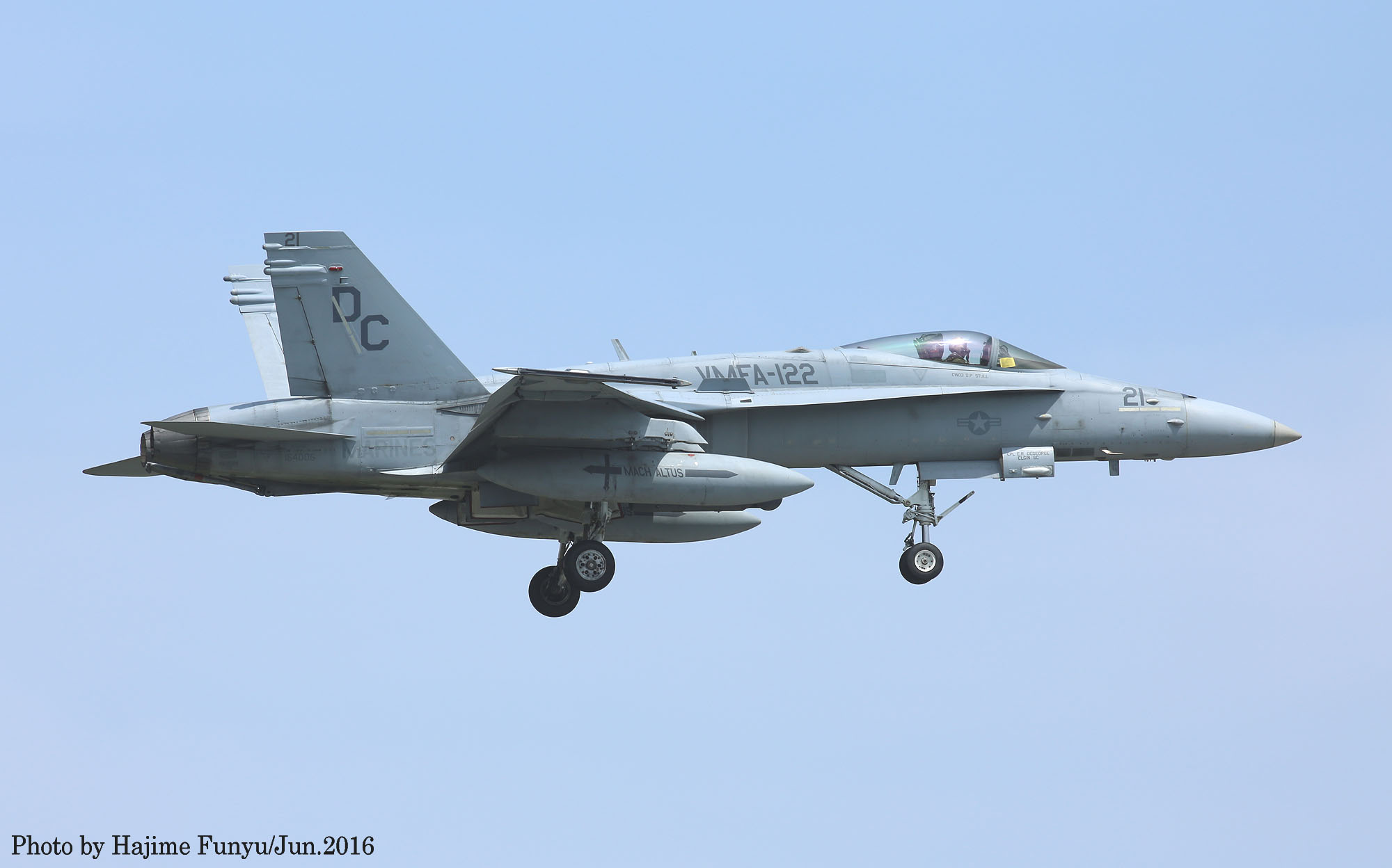 ↑ 2016年6月某日に厚木に降りたVMFA-122のFA-18Cで、この日はDC-00/01/08/21等4機が飛来した。一連の写真はフニュ師匠撮影のものである。