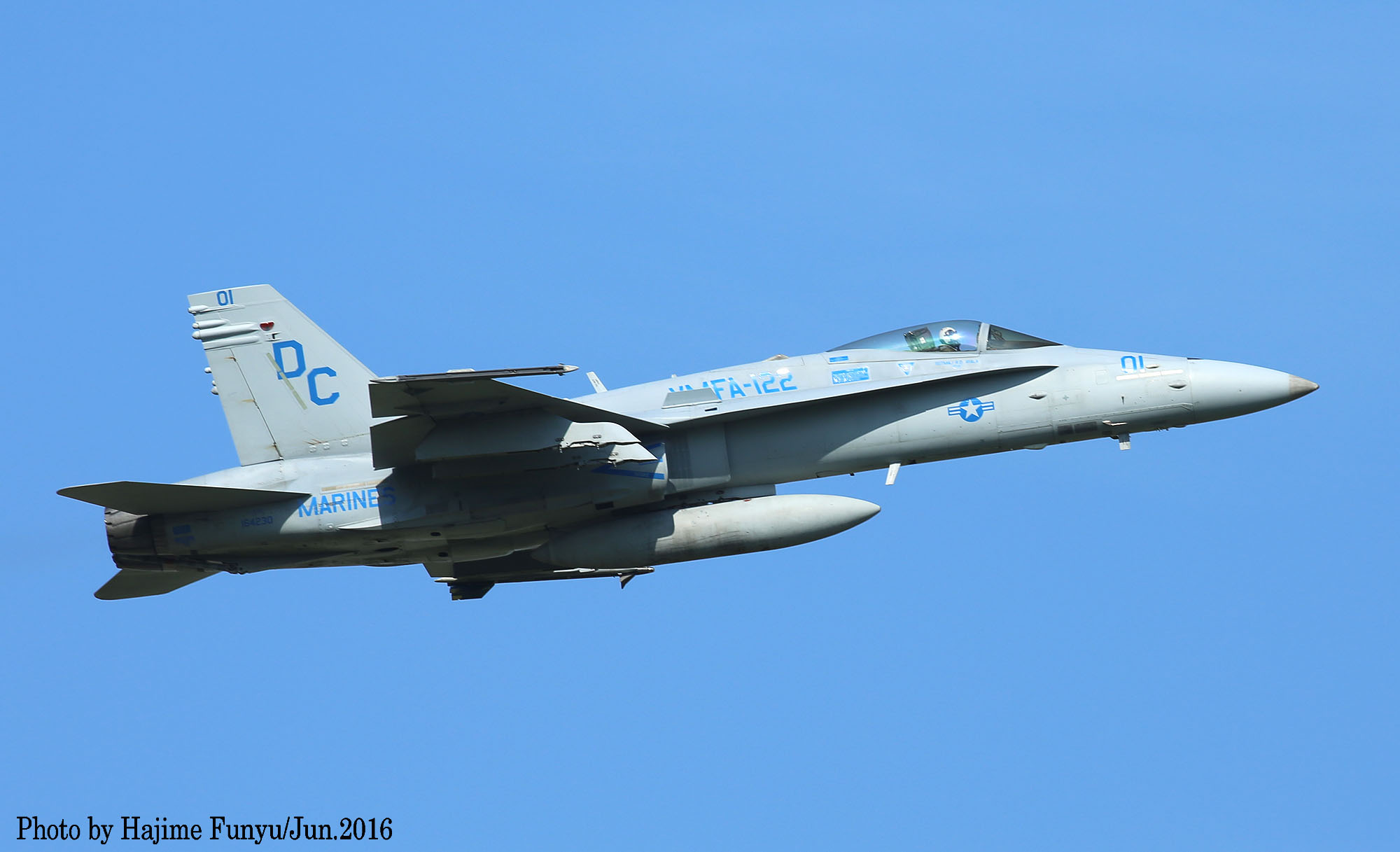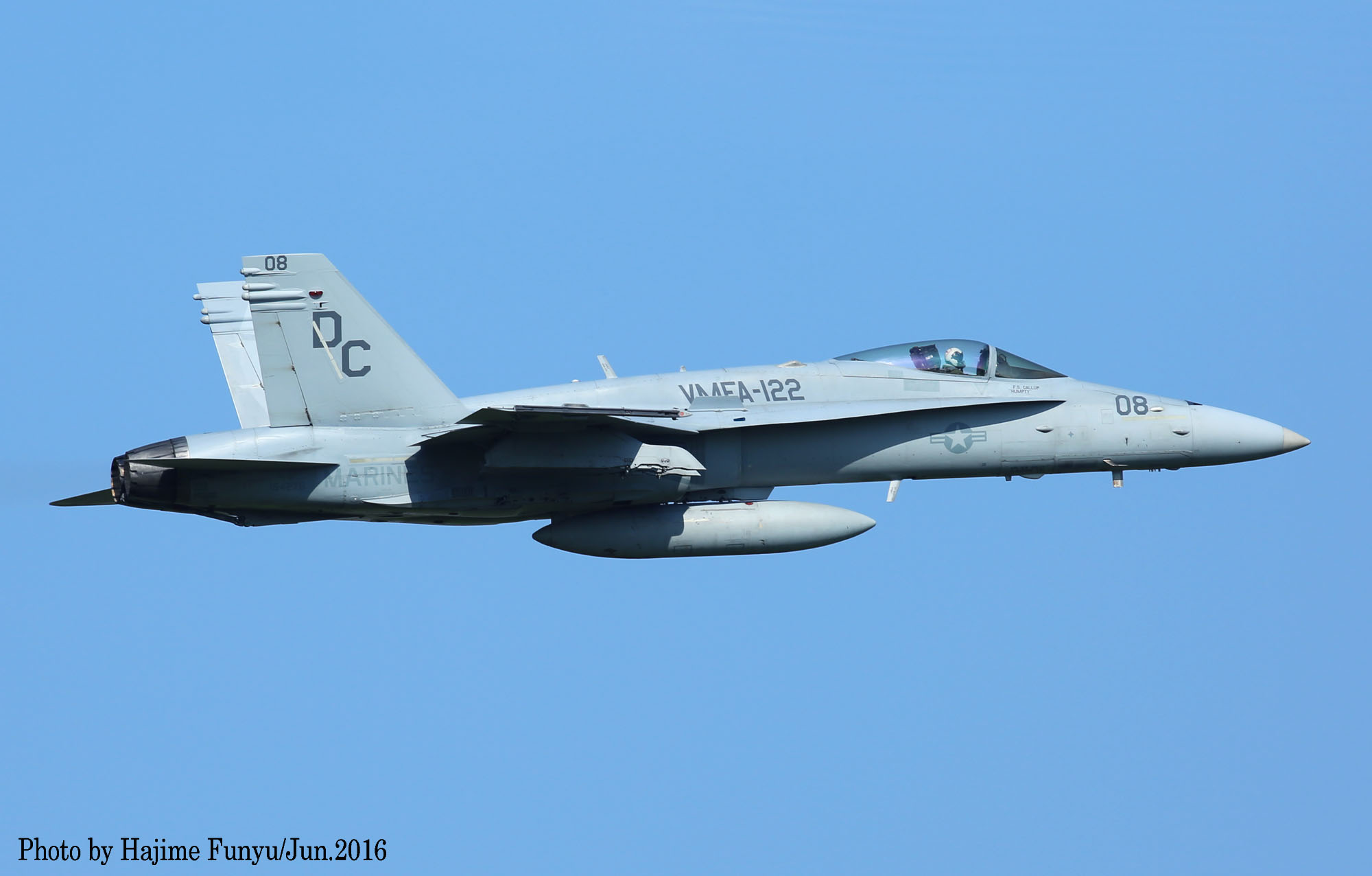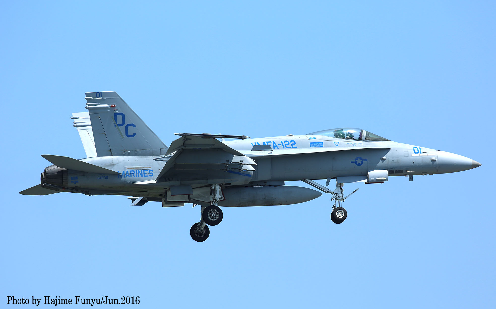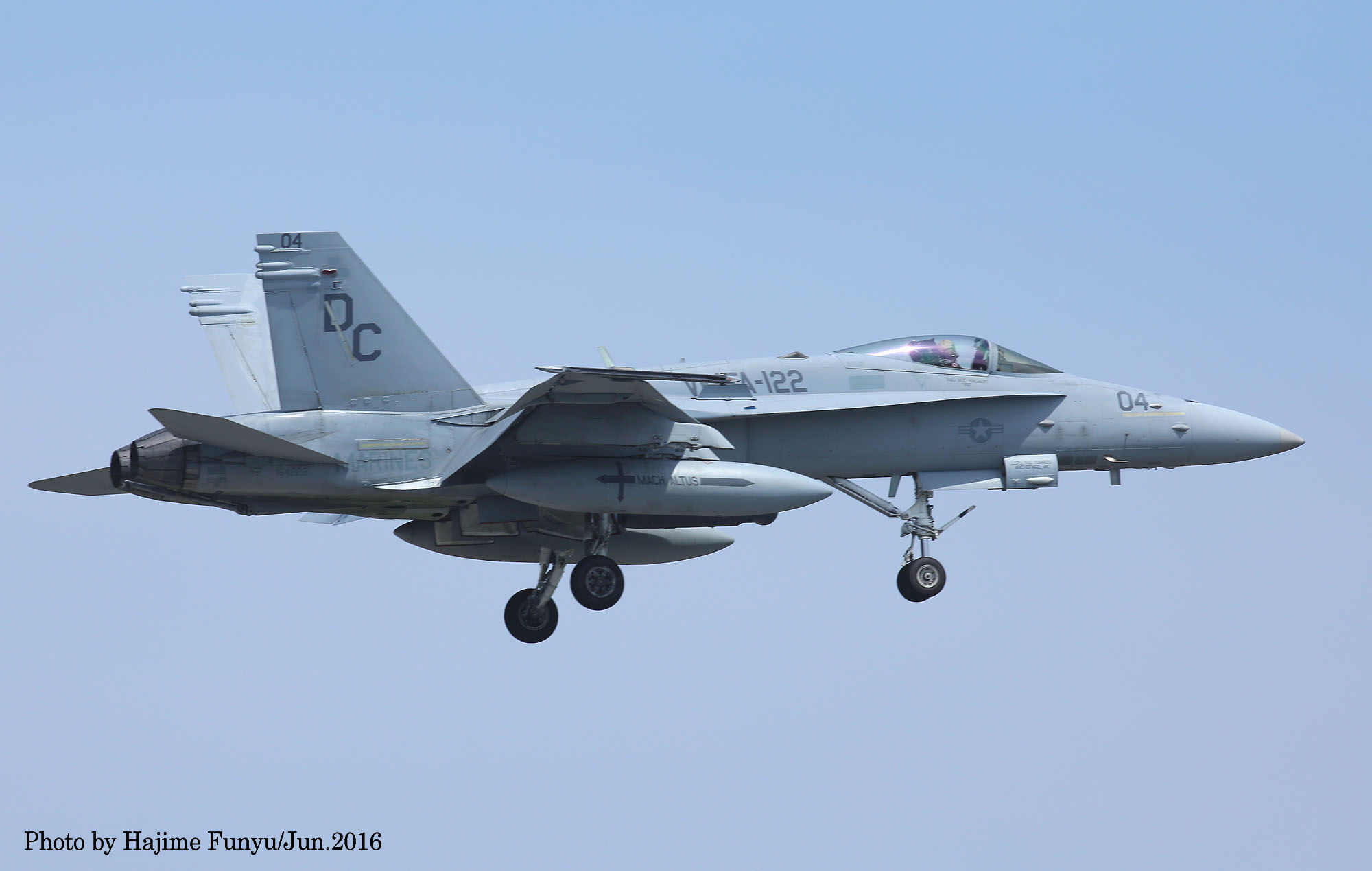 ↑ 2016年6月某日に厚木に降りたVMFA-122のFA-18Cで、この日はDC-00/01/08/21等4機が飛来した。一連の写真はフニュ師匠撮影のものである。