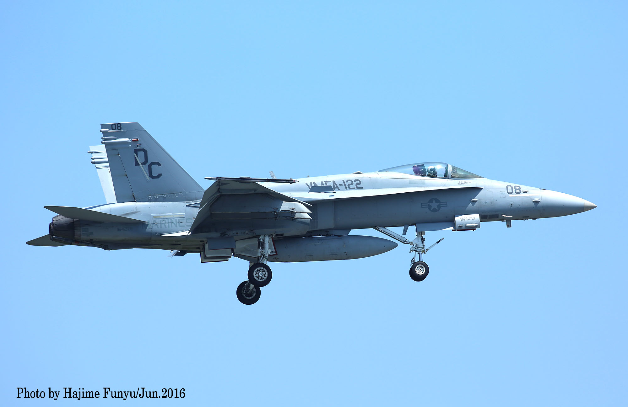 2016年6月には数回厚木基地に降りたったVMFA-122所属のFA-18C,写真は6月中旬2回目に飛来した2機のFA-18CでR/W-19に着陸の様子。2016年の岩国基地派遣はVMFA-122のFA-18Cとしては最後の派遣となり、部隊はF-35Bへの転換に移行し始めた。.