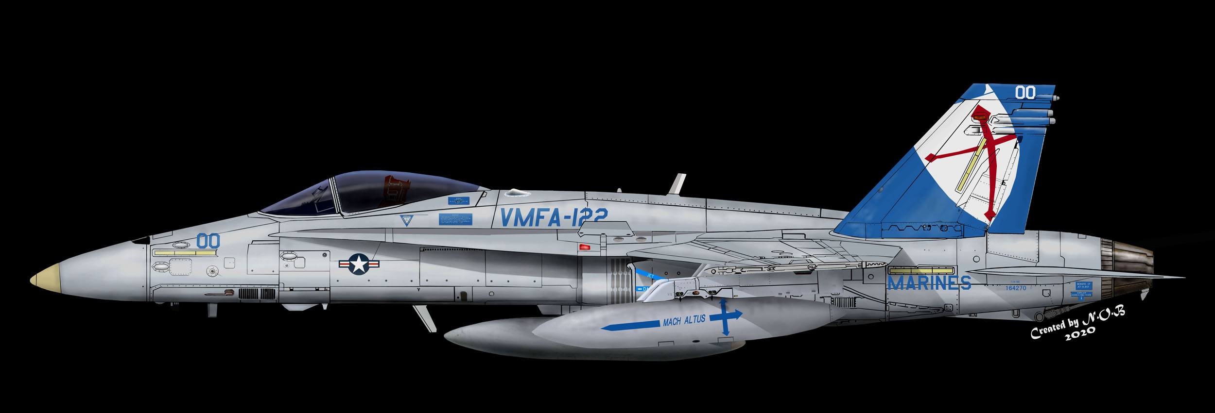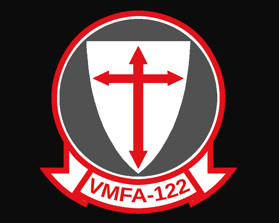 22↑ 2016年に部隊名は、そのままで機体のデザインだけ「十字軍風」に書き換えた。この時の部隊長は、十字軍盾が大きく描かれた8年前のマーキングがお気に入りだったようである。司令官指定機以外の機体もグレーで十字軍の盾を尾翼の内側に描いているが、公式にはクルセイダーズ(十字軍飛行隊)ではなくウルブス(狼飛行隊)である。VMFA-122 F/A-18C Bu.No.164270