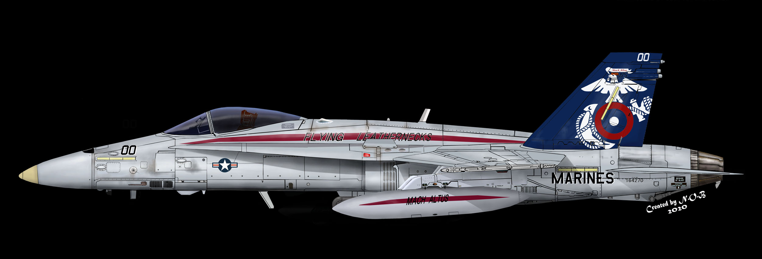 ↑ 2016年12月部隊名まで変えて、司令官指定機は今迄に無かった新マーキングに衣替えである。新部隊名の「FLYING LEATHERNECKS」は、この部隊がデモフライトチームとして活躍していた1947年時代のチーム名から来ているらしい。ジョン・ウェイン主役の有名な航空映画の題名にも使われたネーミングである。尾翼を飾るのは海兵隊徽章。VMFA-122 F/A-18C Bu.No.164270