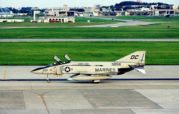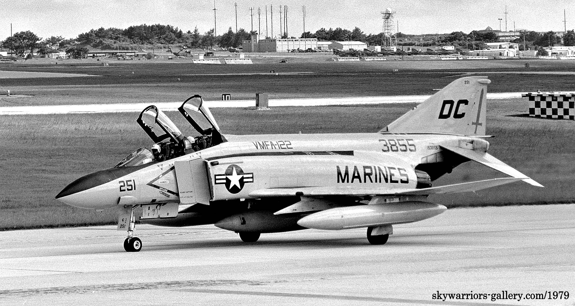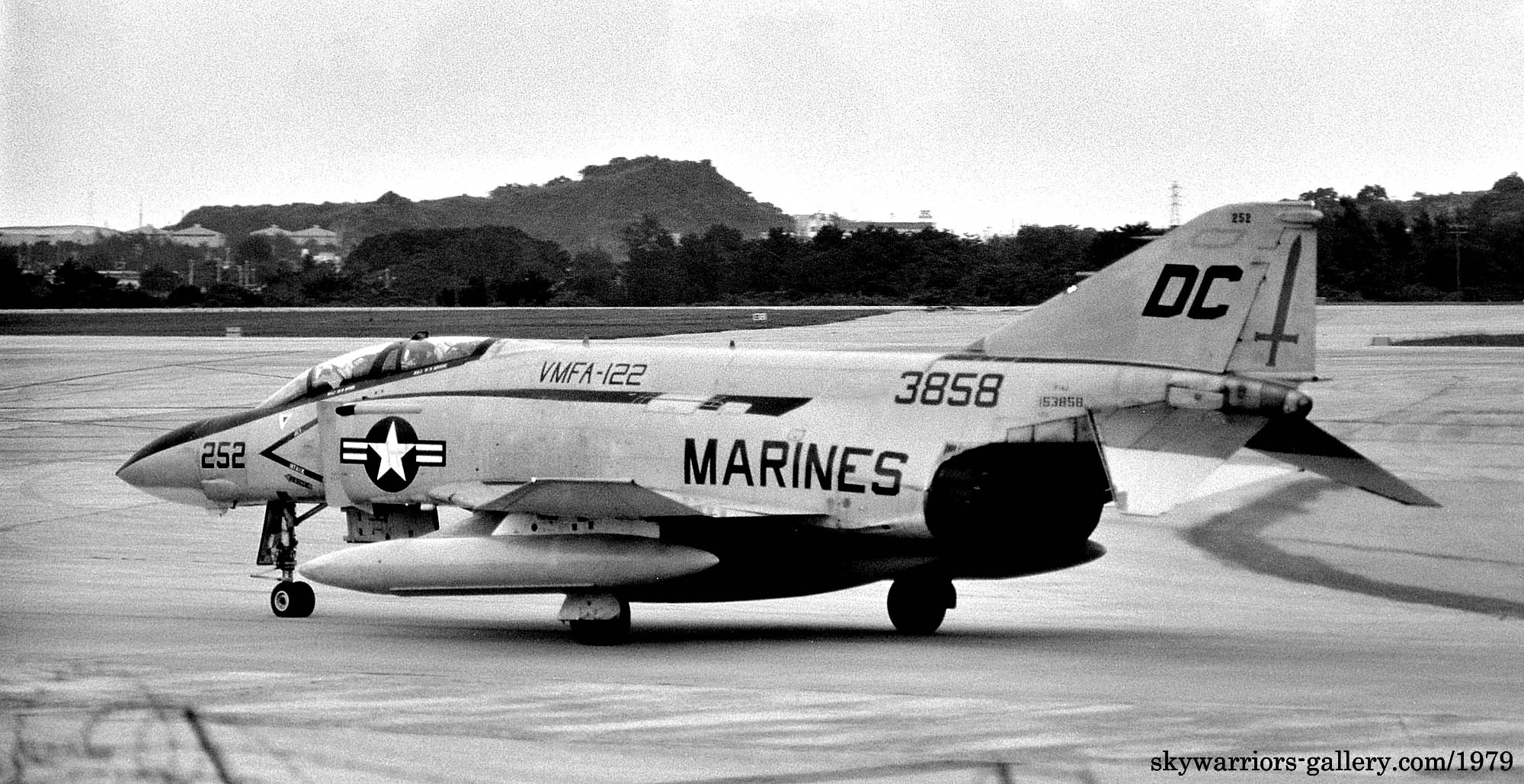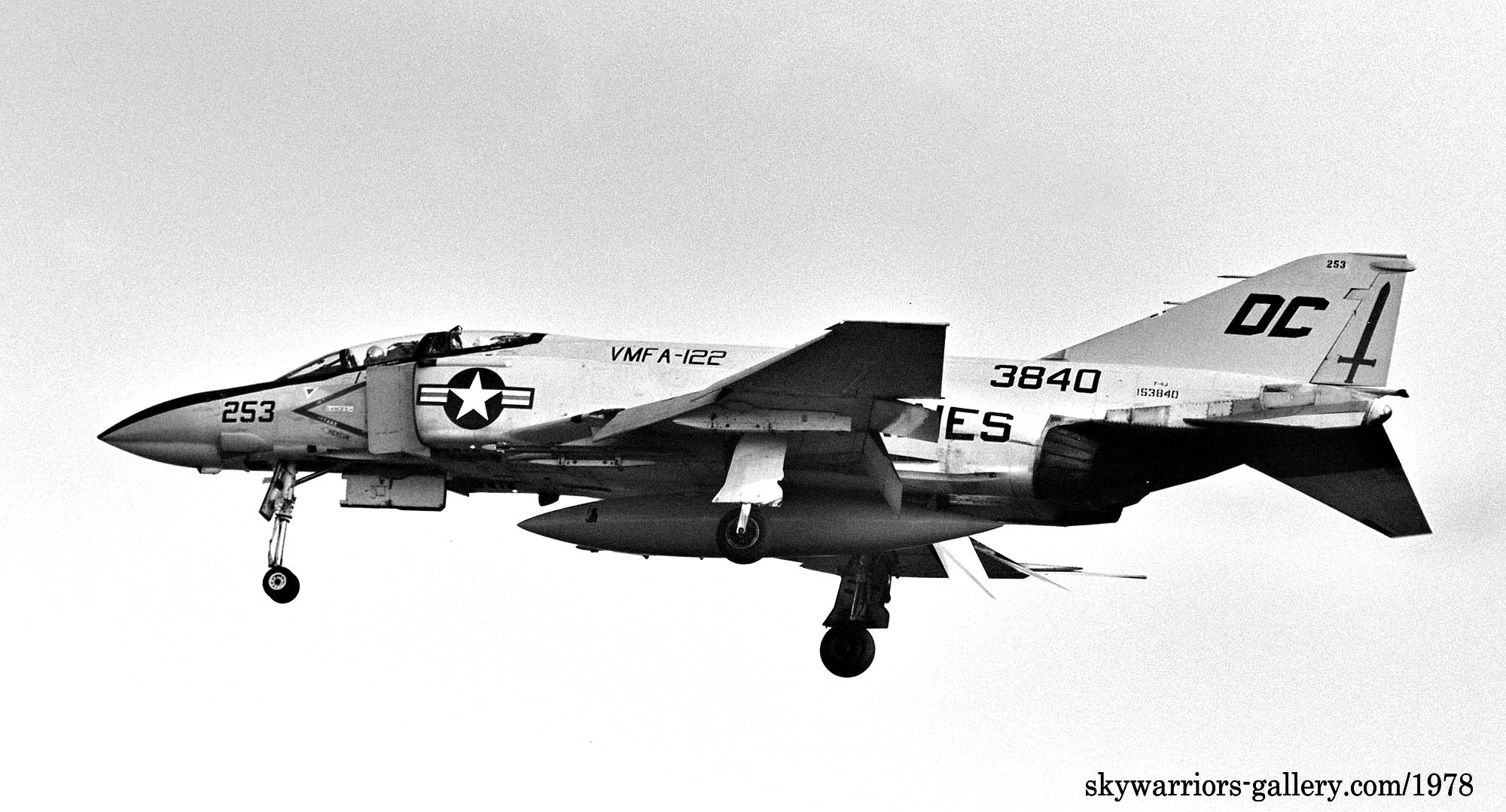 ←1978年10月の嘉手納基地、8月下旬から北風が吹いてR/W05が多い。VMFA-122は、岩国からここに訓練に来ており良く訓練飛行を実施した。海兵隊では低視認性のロービジマーキングをこれから全面的に導入しようとしていた時期で、F-4Jを使っている海兵隊の飛行中隊でも配色に制限が加わり、以前のように派手なマーキングは姿を消しつつあった。VMFA-122も 剣を胴体に大きく描いたマーキング時代もあったが、そうした派手なマーキングは、既に期待できないご時世になっていた為、青い剣が書れただけでも嬉しかった。