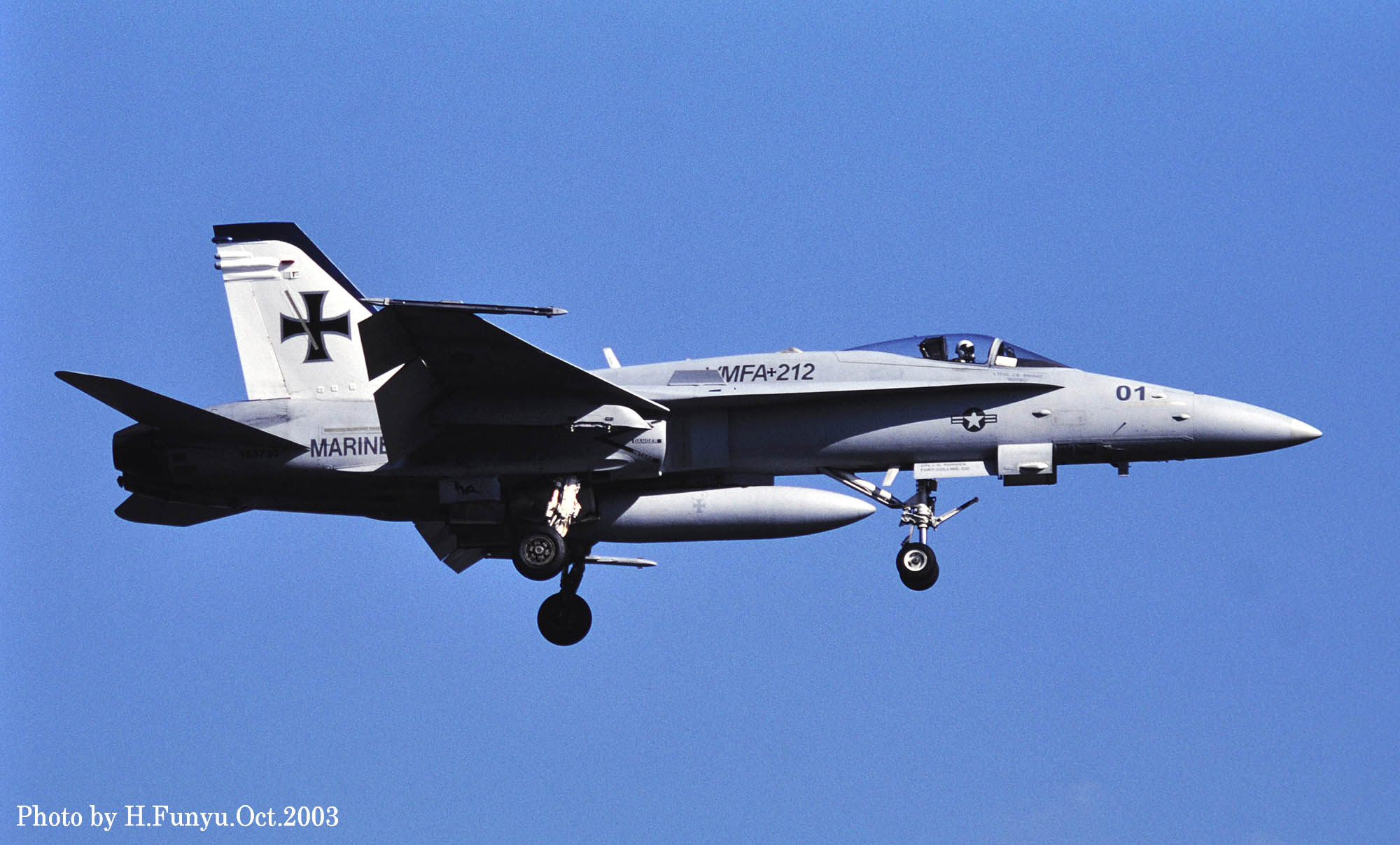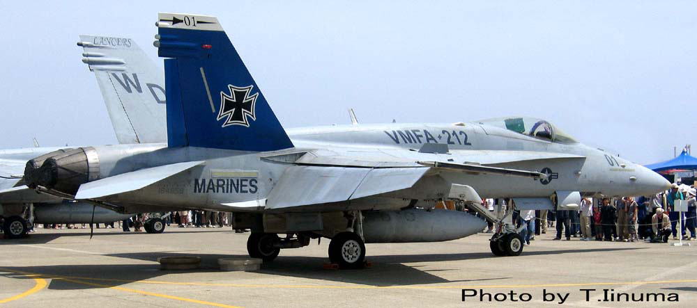 ↑ VMFA-212のコマンダー機”ランサー01”は過去何度もマーキングを換え、その都度マニアから熱い視線を送られてきた。上の写真は2005年3月から使用されたマーキング。VMFA-212にFA-18が配備された初期のデザインをベースとして、シンプルなデザインとなったが、バルケンクロイツの枠にしまりがなくマニアからはあまり高い評価を受けなかった。