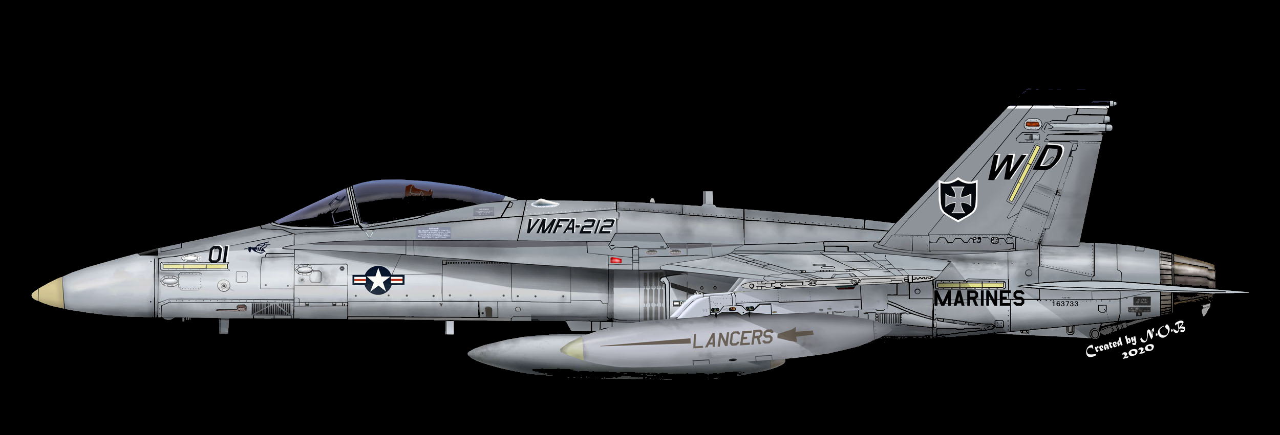 ↑ 1997年10月頃の司令官指定機でC型の初期タイプ、機体部隊番号・Modexなどの字体は、海軍機のような角ばった字体が使われていたが、この後から登場するマーキングは、ゴシック調の丸びを帯びた字体になった。尾翼のバルケンクロイツは、中抜きグレー、機首にホーネット由来のスズメバチが書かれている。F/A-18C