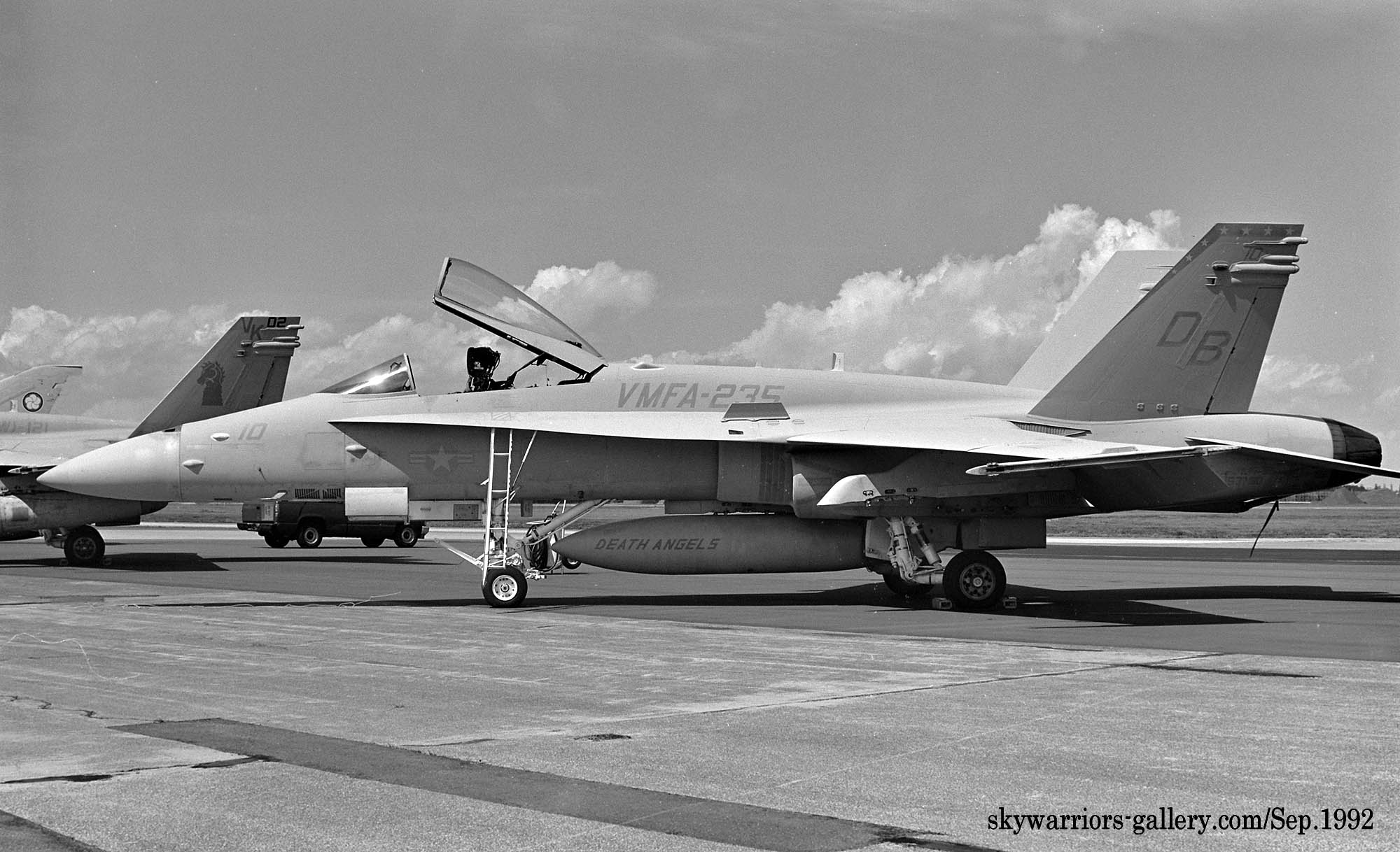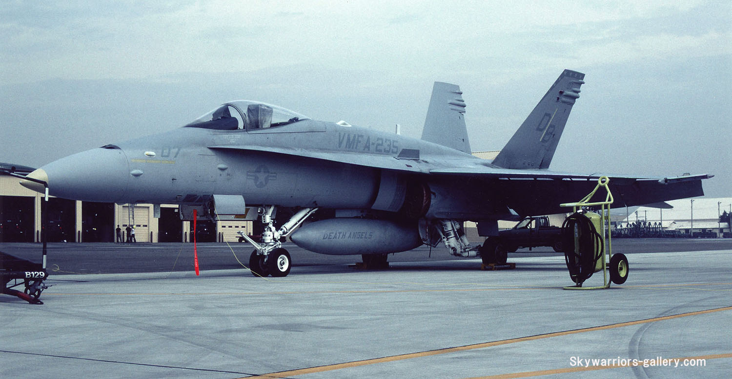 1989年11月VMFA-235 Daeth Angelsは、FA-18Cを受領し、翌年に発生したイラク軍のクウェート侵攻に伴いデザート・シールド作戦に従事。1990年8月バーレーンのシャイフ・イサ空軍基地に配備され、この作戦で最初に活躍した飛行隊として名を成した。砂漠の嵐作戦において海兵隊は、海空軍と迅速さを争う形で遠征が進められ、8月には第一陣として第一海兵遠征軍から45000人が派遣されイラク軍に対峙するとともに、海兵隊航空も空からの支援の為F/A-18A,C,Dを持つ6個飛行隊が派遣された。ハワイの第一海兵旅団からは、VMFA-235と共にVMFA-232からも各12機が派遣され、翌年1月17日から始まった本格的な空爆と地上軍の援護などで活躍。開戦初日にイラク軍のMig-25にFA-18(所属不明)が撃墜されるなど被害もあったが、ほぼ完全勝利の形で戦争は終結した。VMFA-235と言えば、、彼らの出撃回数は2800回を記録し、7か月間の作戦期間を経て母の基地ハワイに戻った。