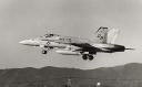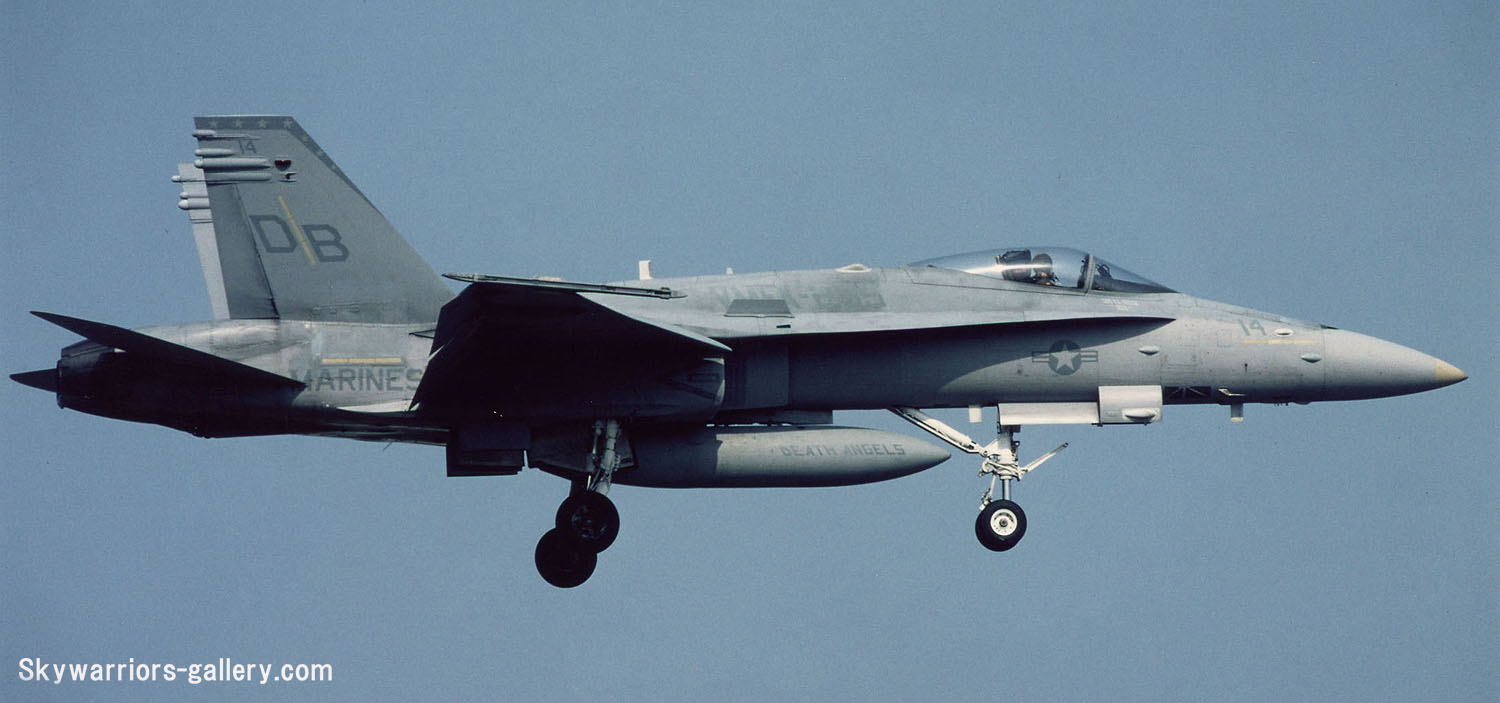 1994年岩国に駐在した際のデス・エンジェルスの隊長機.F/A-18Cの初期型でありIFFアンテナ等もない。この機体だけが、赤いシェブロンを復活させたものだが、それ以外の部分はロービジが徹底されている。センタータンクの部隊名が入っている。F/A-18C DB-00 Bu.No.163702