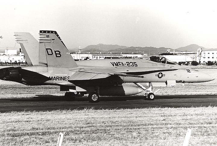 VMFA-235のFA-18Cの初来日(岩国配備)は、意外に遅く1992年8月である。彼らが1987年に岩国基地を去って5年ぶりの来日となった。次に1994年 1995年と2年続けて 海兵隊岩国基地配備となったが その後来日しないまま、アメリカ本国で解散したので残念である。真っ赤なレードームに白い星をちりばめたFA-18Cを夢見ていたのだが・・・・