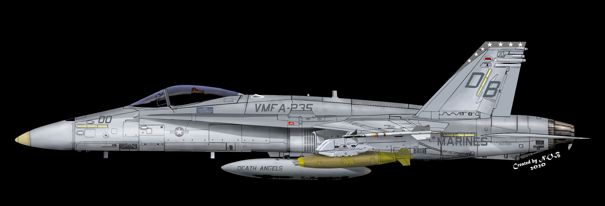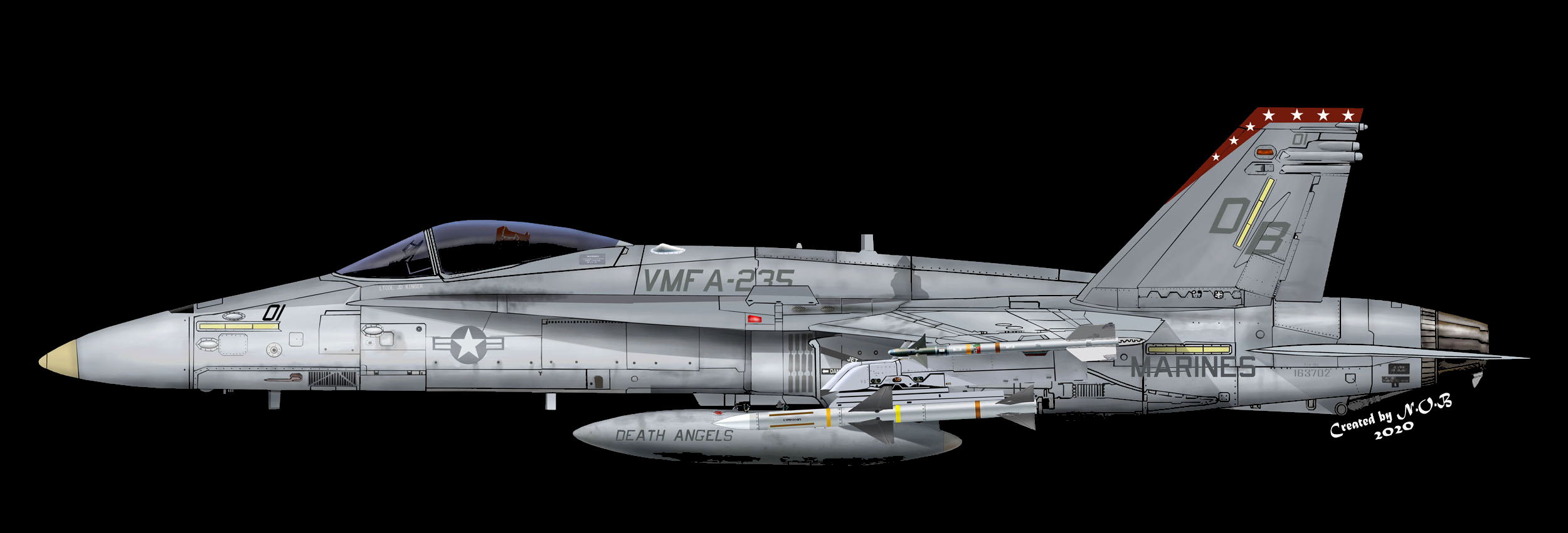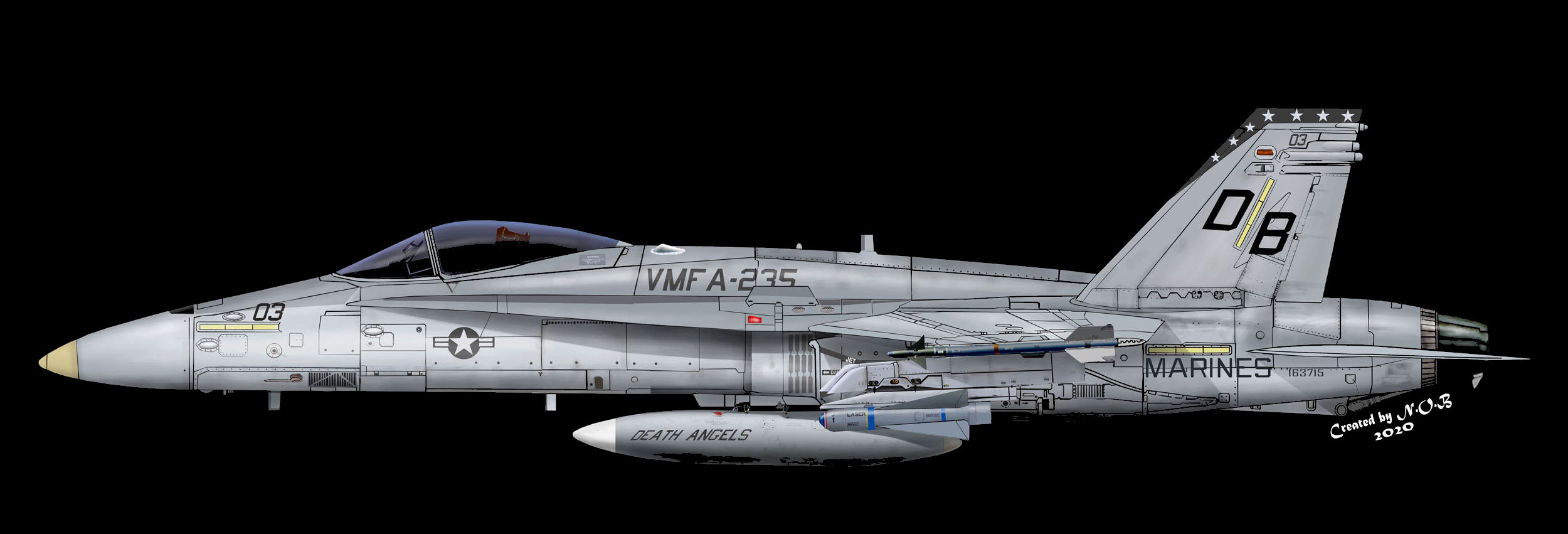 1995年インシグニアや機番が薄いグレー色から 黒に近いダークグレーに塗りなおされた。これによりVMFA-235のマーキングは、アクセントがはっきりして見栄えが良くなった。F/A-18C DB-03 Bu.No.163715