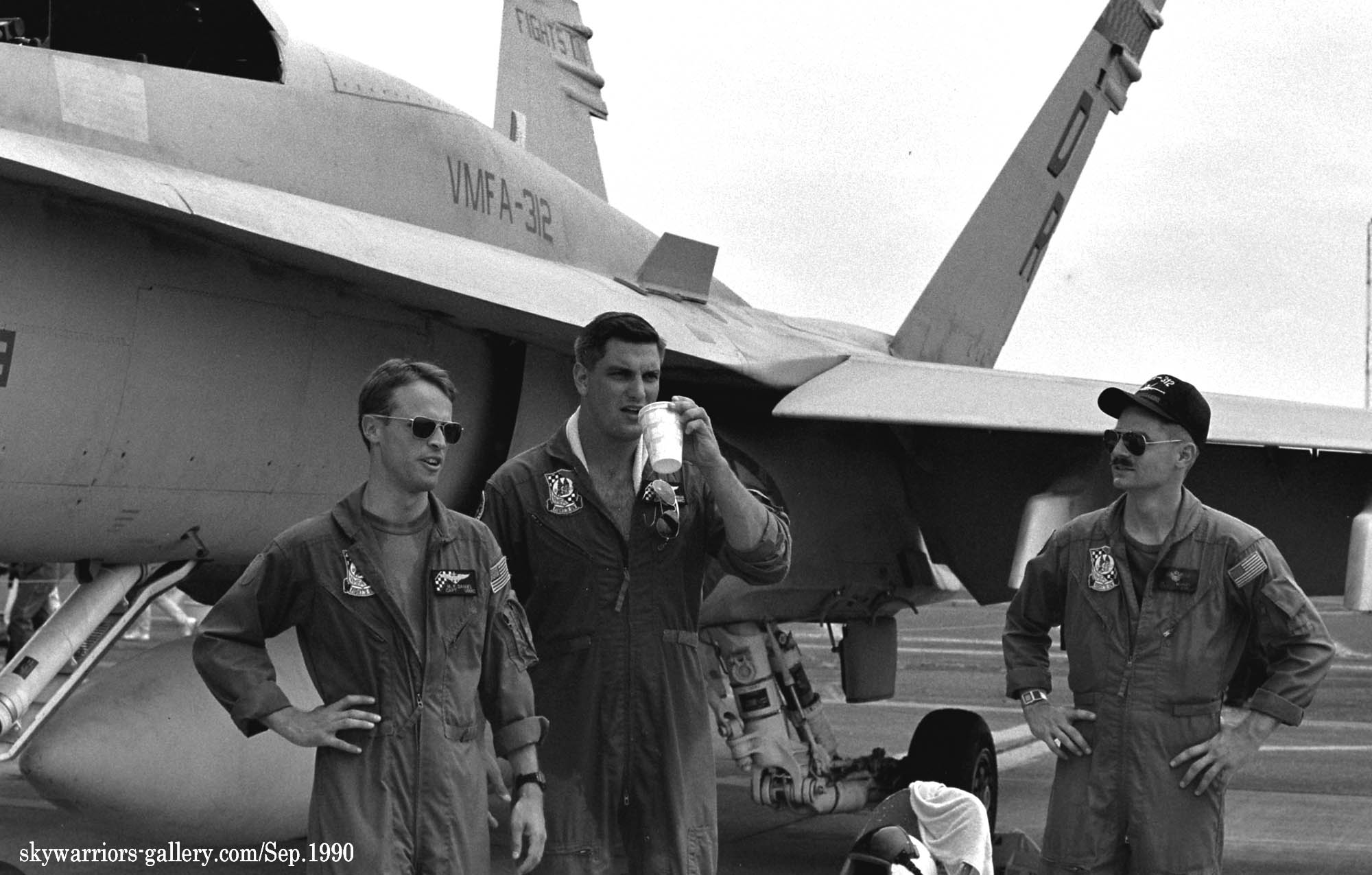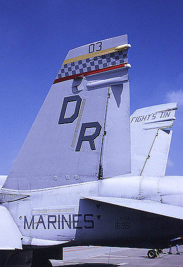 ↑ 1988年、F/A-18Aを運用していた頃のVMFA-312のマーキング。尾翼のチェッカー模様以外はほぼ完璧なロービジ塗装であり、背中の部隊ナンバーも薄く表記されていた。この頃のA型は、背中の整流板が見られない。この時期から尾翼の内側に部隊モットーである”FIGHT