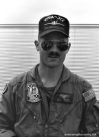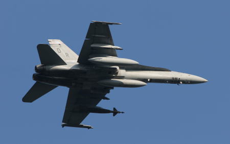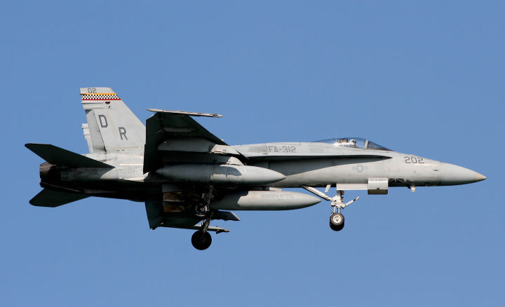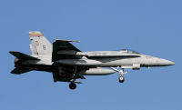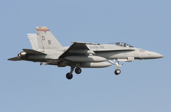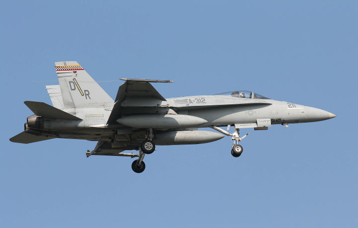 ↑ 2016年に岩国でも確認された司令官指定機でIFFアンテナ付DR-200機番や部隊ネームが黒色でまとめられた事からシックな印象を受ける。他の機体が、テールレターをAC(後にNA)としていた中、唯一200番だけが「DR」表記であった。但し、空母搭載時は「AC」レターに戻りコックピット下にはCAGのネームを入れている。 F/A-18C Bu.No.164871 DR-00