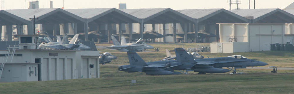 嘉手納で撮影するなら、朝は早くなければいけない。7時半には嘉手納着、まず、いつもの丘に上がり嘉手納を展望、「うむ 2度目の飛行停止となったF-15は、静かにハンガーでお休み中であるが、エプロンには多数の海兵隊機が駐機しており、何やら整備員も出ている。少し期待に胸を膨らませて、エプロンを注視。あれ?F-18の数機はJDAMをぶら下げているではないか、「これはしめたものだ、今週も訓練するぞ。」 しかも、ハリアーまでいるではないの!早速 可愛いEOS-Kissに300㎜(2.8)つけてR/W23側に上がりを撮りに向かう。VMFA-312は、最近殆どお目にかかっていない飛行隊であったから、今回飛来していたホーネット御三家(DR・VW・WD)の中で 一番嬉しかった部隊であった。(2007/12/25 記)