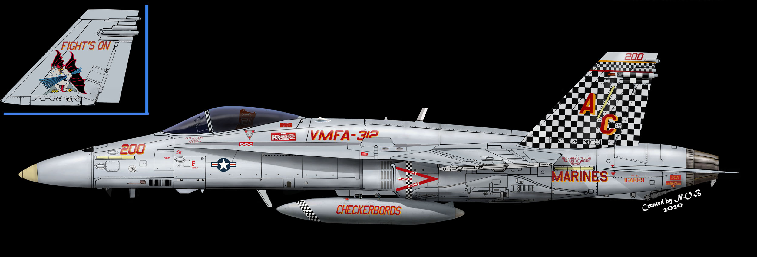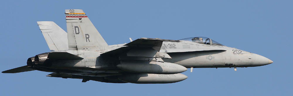 ↑ F-4SからF/A-18Cに機種交換して後、最初に施された派手なチェッカーマーキングがこの機体で、航空マニアが多くの写真を残している2009年に空母搭載の際、CAG指定機として塗られ、尾翼全体を白黒の市松模様として機番やその他注意書きも朱色を用い、海兵隊機で最もエキサイティングな塗装であった。F/A-18C Bu.No.163889 DR-200 搭載空母はUSSハリー・トルーマンCVW-3