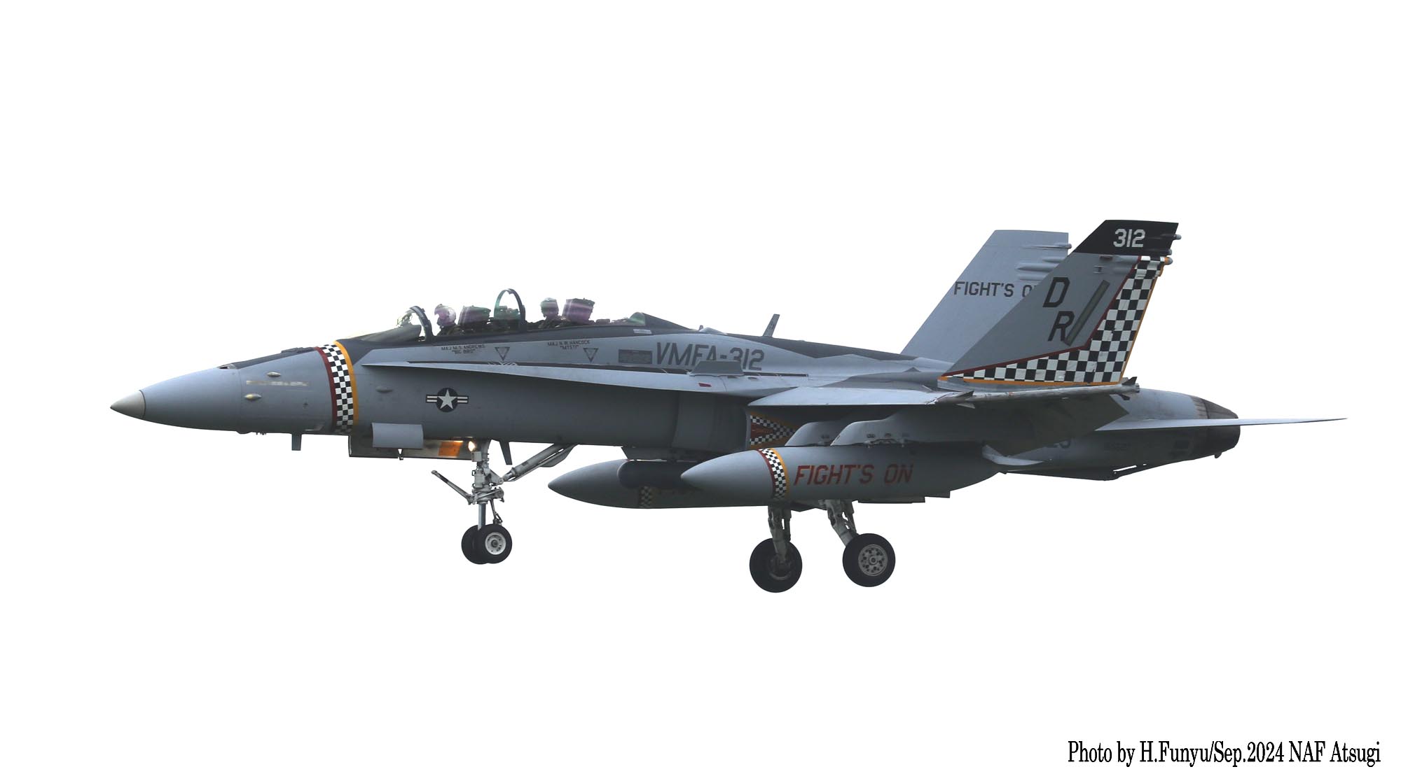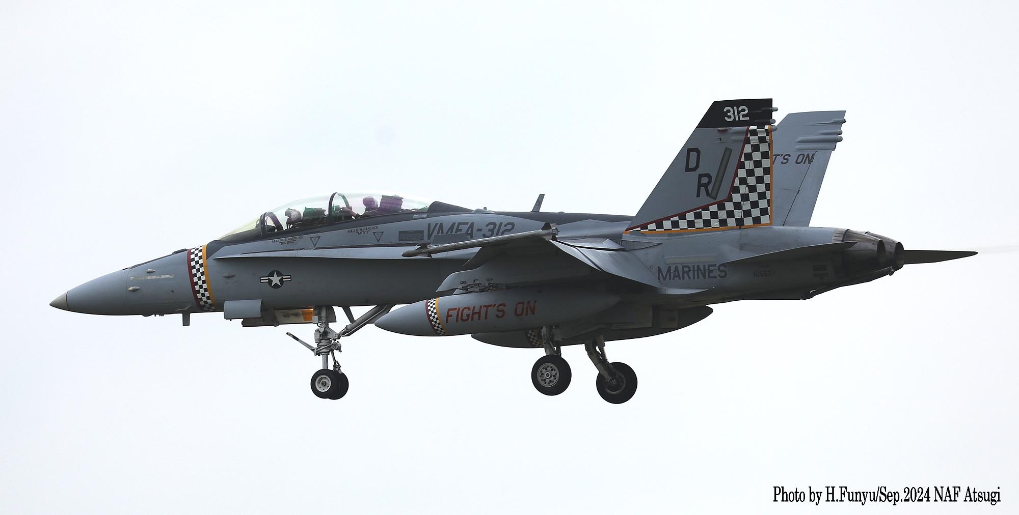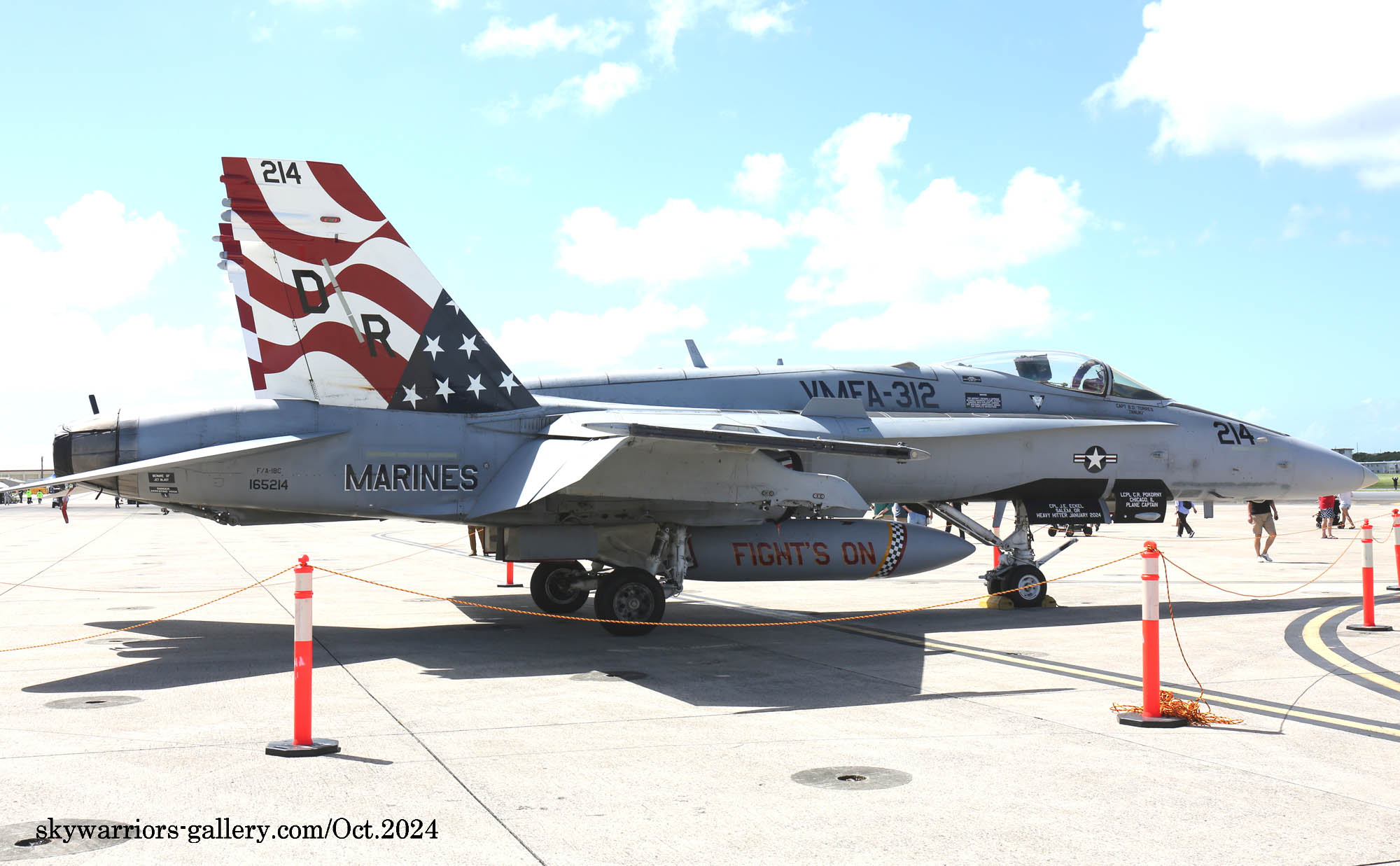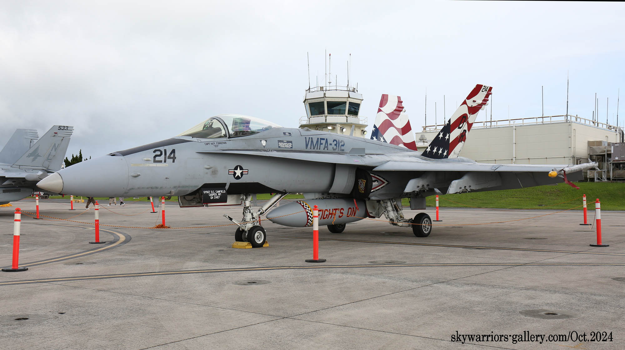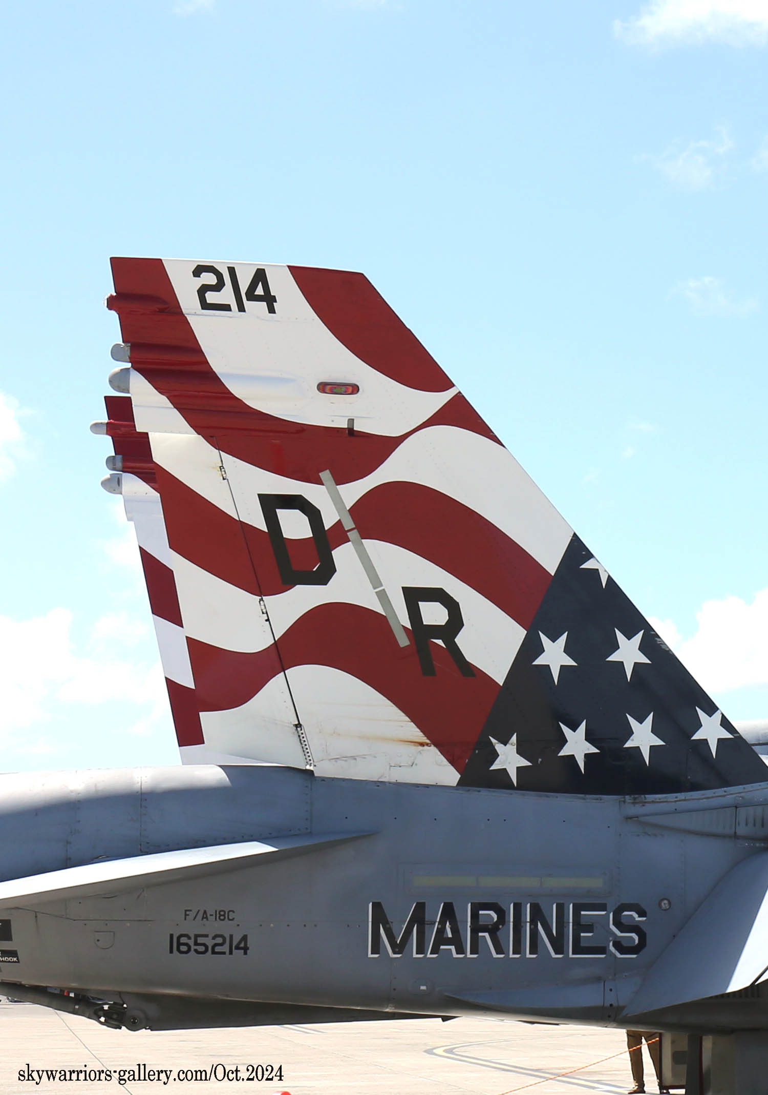 2024年10月7日サウスカロライナ州ビューフォート海軍航空基地からハリー・トーマス中佐率いるVMFA-312”Checkerboard"のFA-18C/Dが飛来した。10機のレガシーホーネットで部隊編成されているようだが、内3機が特別塗装を施され、またまた航空ファンを熱気に包みそうである。1機は、VMFA-115で長年使われてきた星条旗尾翼のあの機体FA-18C/Bu.No.165214だ。何と”VE”が”DR”に書き換わっている。注目はその他の2機、1機はファントム時代のマーキングを復活させ黄赤の2色で尾翼をぬり分けた塗装でFA-18Cホーネットになってからは初めてのマーキングである。