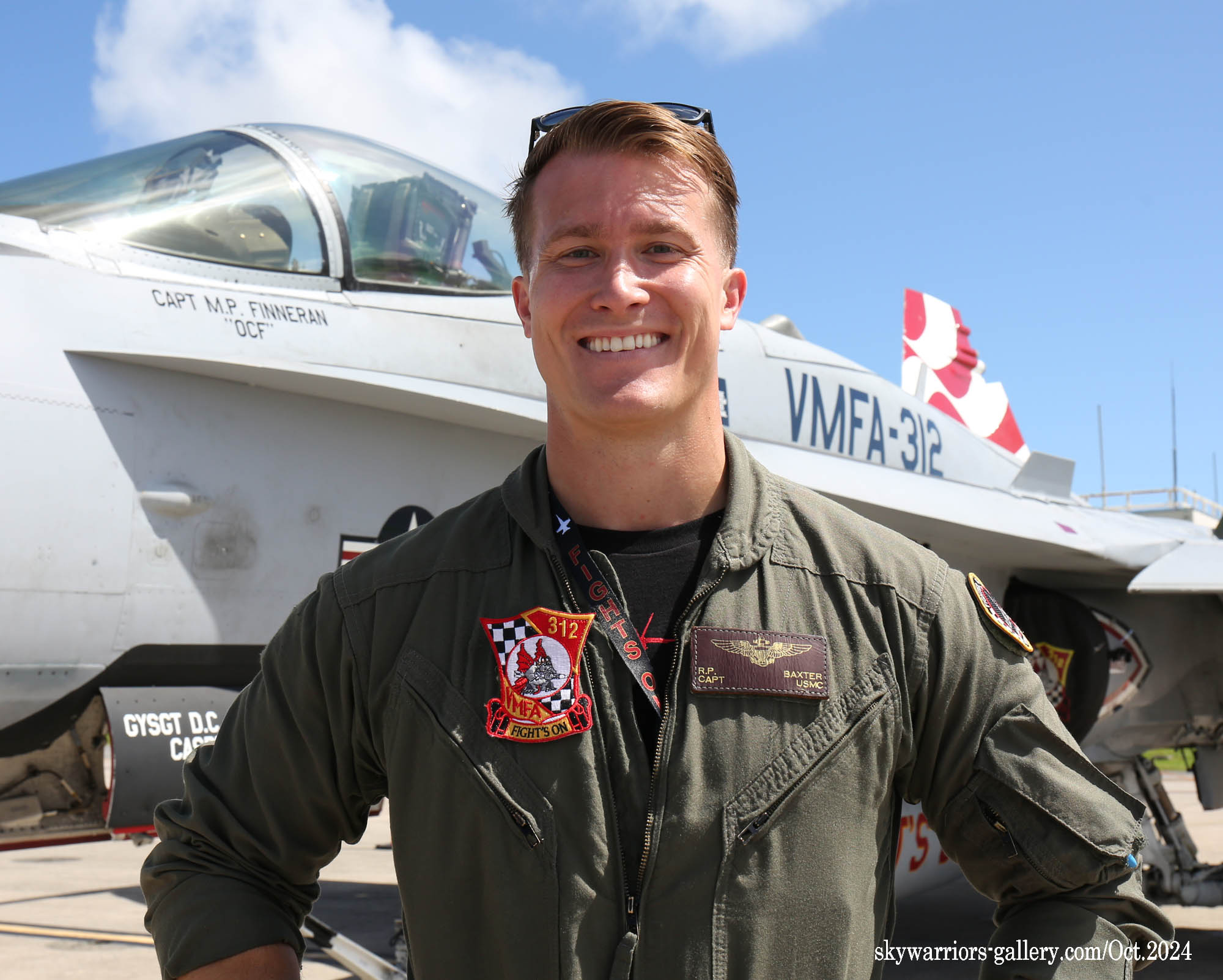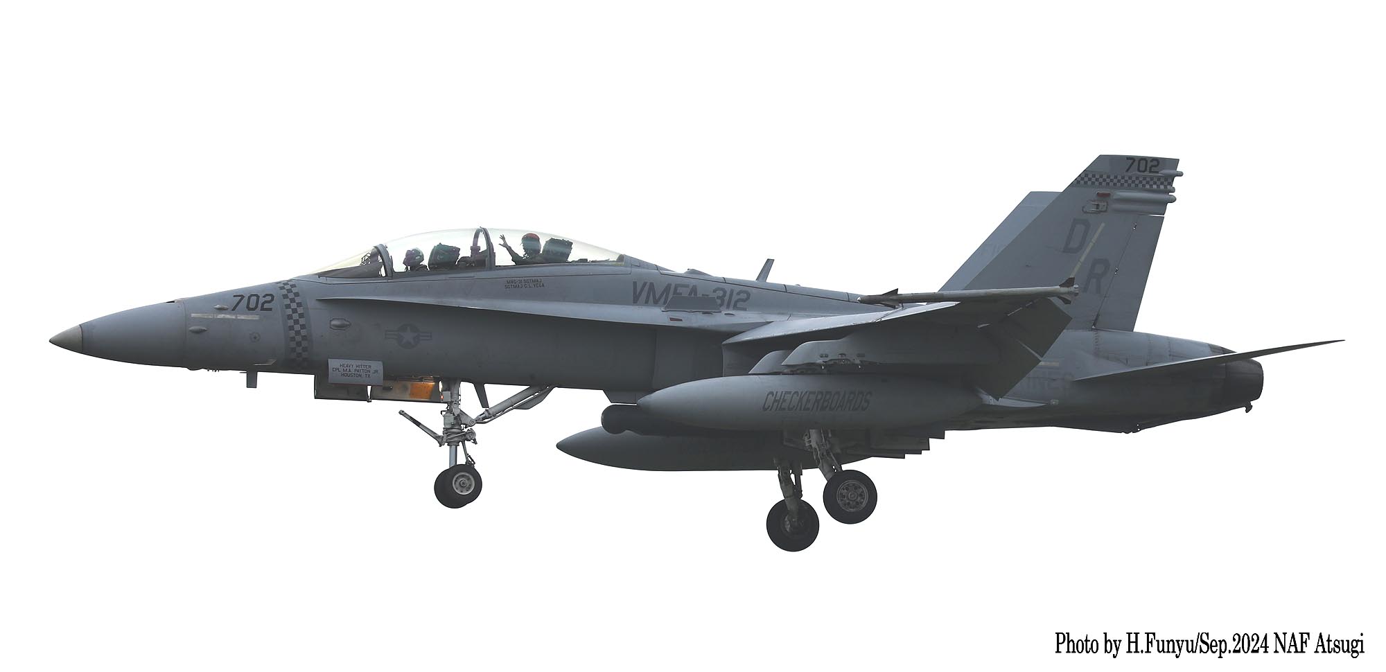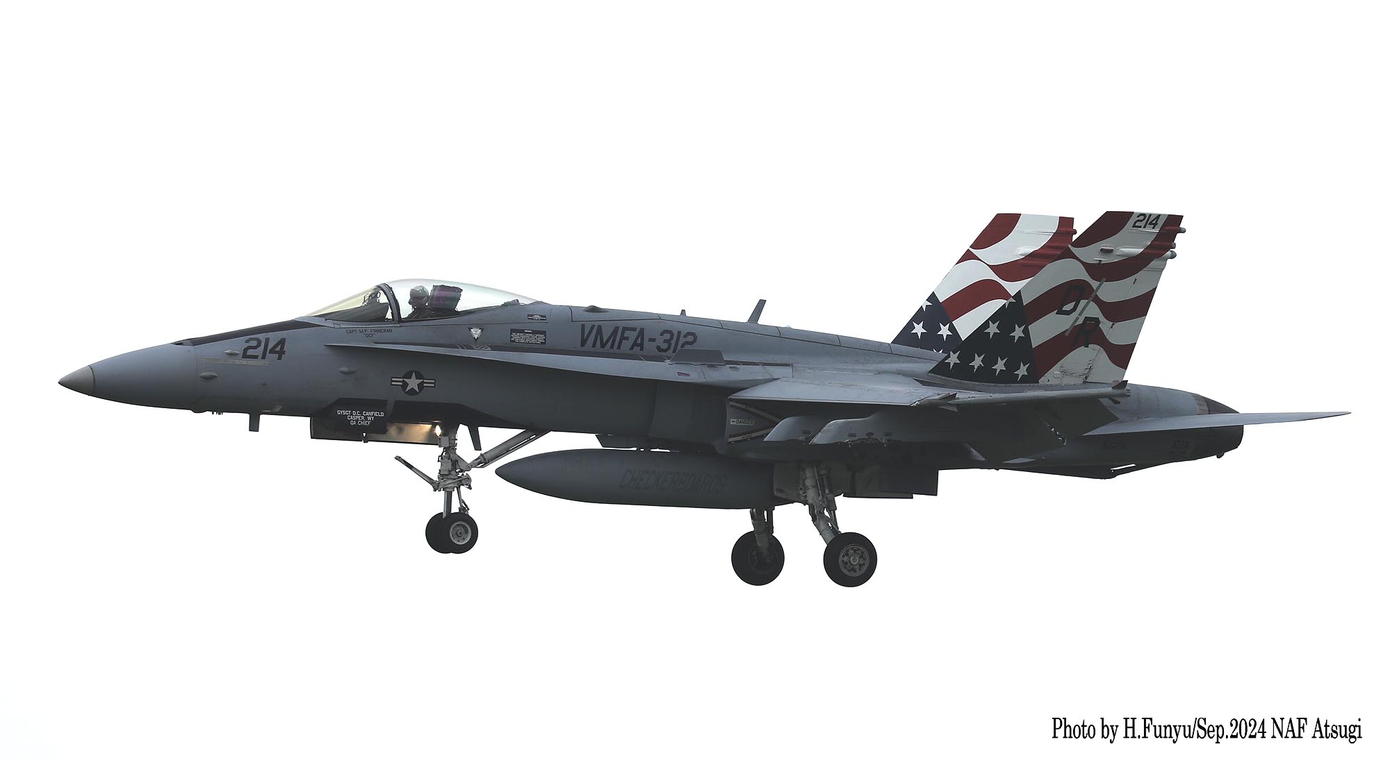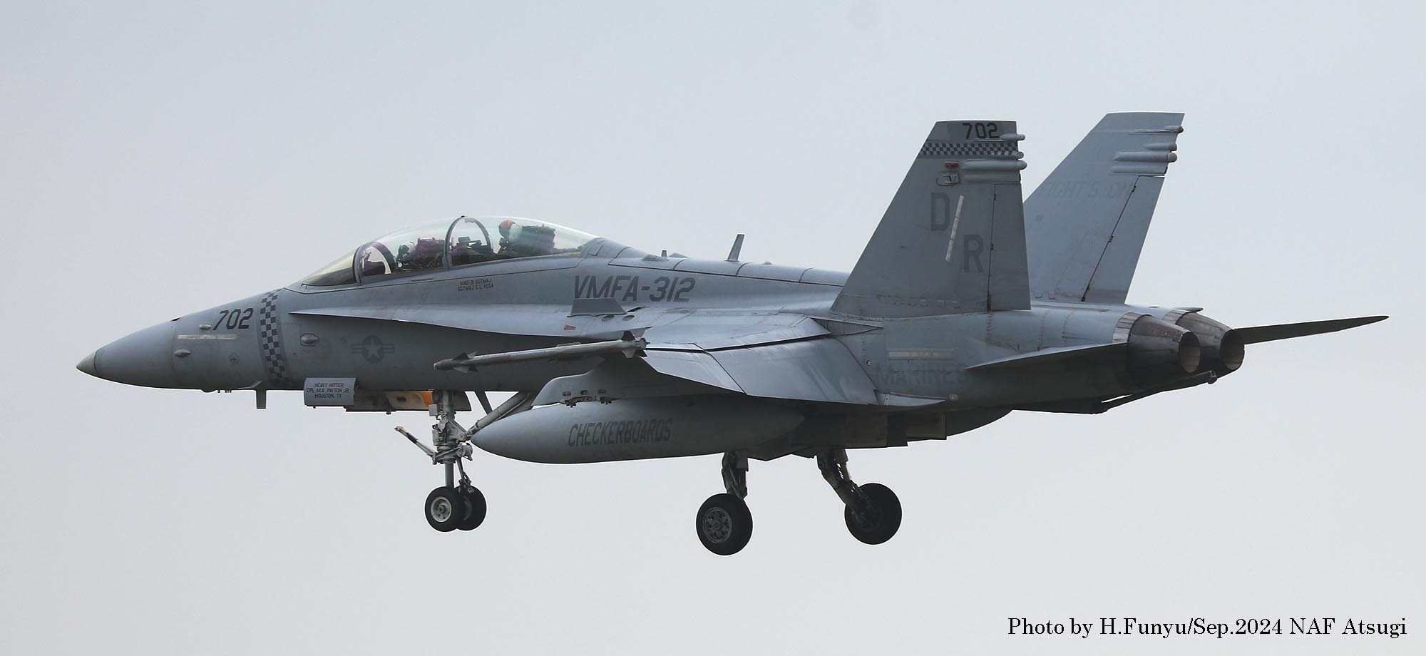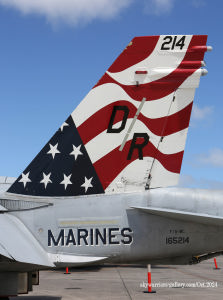 2024年10月7日サウスカロライナ州ビューフォート海軍航空基地からハリー・トーマス中佐率いるVMFA-312”Checkerboard"のFA-18C/Dが飛来した。10機のレガシーホーネットで部隊編成されているようだが、内3機が特別塗装を施され、またまた航空ファンを熱気に包みそうである。1機は、VMFA-115で長年使われてきた星条旗尾翼のあの機体FA-18C/Bu.No.165214だ。何と”VE”が”DR”に書き換わっている。注目はその他の2機、1機はファントム時代のマーキングを復活させ黄赤の2色で尾翼をぬり分けた塗装でFA-18Cホーネットになってからは初めてのマーキングである。