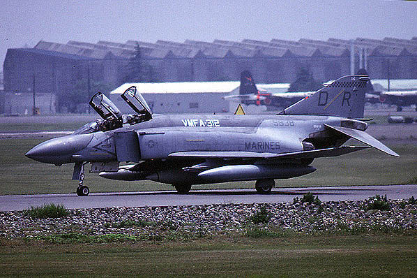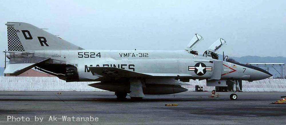 以前VMFA-312は、チェッカーボードの部隊名の通り 白黒のチェックを大きく尾翼に描いていたものの 来日時は、すでに主流になり始めたロービジ塗装を採用 グレーの機体に細かい黒のチェックを入れての登場であった。以前のような派手さには欠くが、嘉手納を訪れていたマニア諸氏は一様に感激してシャッターを切ったものである。その後 S型ファントムになってからも岩国に駐留しているが、チェックはグレーの濃淡と益々醜くなっていた。VMFA-312は 1987年にFA-18Aホーネットに更新し 再び岩国を訪れるが、長い間忘れ去られていた赤と黄のトリムラインが、再び復活しているのには驚いたのものである。(2002/6 記)