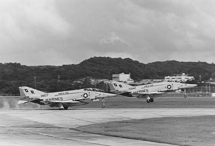 ↑ 嘉手納基地で離陸の為、R/W-23エンドで待機する2機のF-4J。なんと彼らの前進であるVMF-312の最初の実戦が、ここ沖縄だった。米軍が沖縄を占領後、中飛行場と呼ばれた当時の嘉手納基地をベースに終戦まで戦い、日本軍機約60機を撃墜している。その多くは、沖縄に飛来する特攻機と思われる。