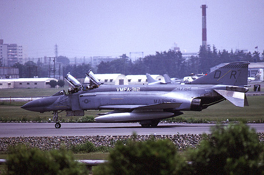 VMFA-312は、チェッカーボードという部隊名である。まるで標的曳航を専門に請け負う飛行隊のようなネームとマーキングの部隊だ。VMFA-312は1966年にビューフォートで設立され、F-8クルセダー時代も時折日本に飛来もしたそうだが、1979年の夏にF-4Jを装備してから、初めての岩国駐留を半年行った。それまでは雑誌の中でしか見る事のできなかった部隊だったので、嘉手納に初飛来した時の興奮は今でも忘れない。下のサムネール内に嘉手納基地のR/W23Rにフォーメーションでタッチダウンしている写真を掲載したが、それがF-4Jとなってから、嘉手納初飛来の時のものだ。