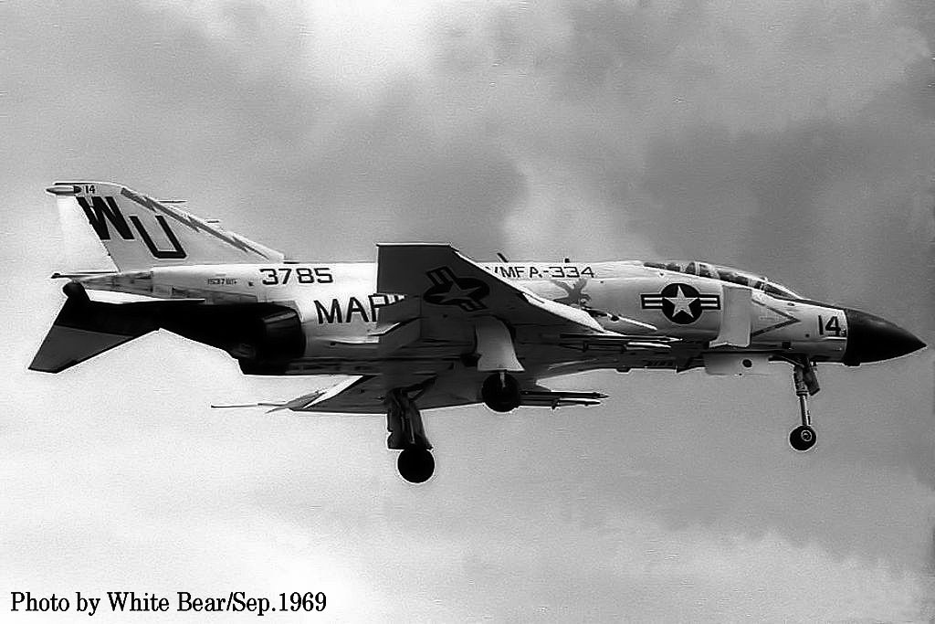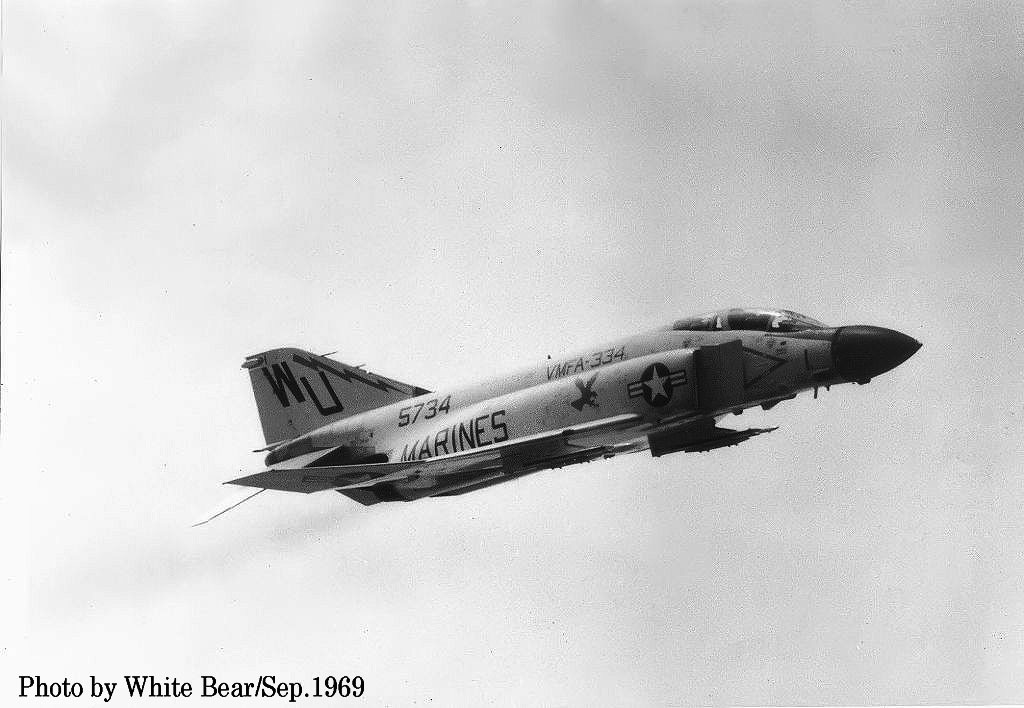↑ 本項一連の写真は全て、White Bearさんが1969年9月岩国基地で撮影されたVMFA-334のF-4Jの写真である。岩国の旧滑走路をR/W-02で離陸するVMFA-334のF-4J/WU-01。この機体は1979年にVMFA-235/DB-162として岩国に来ている。