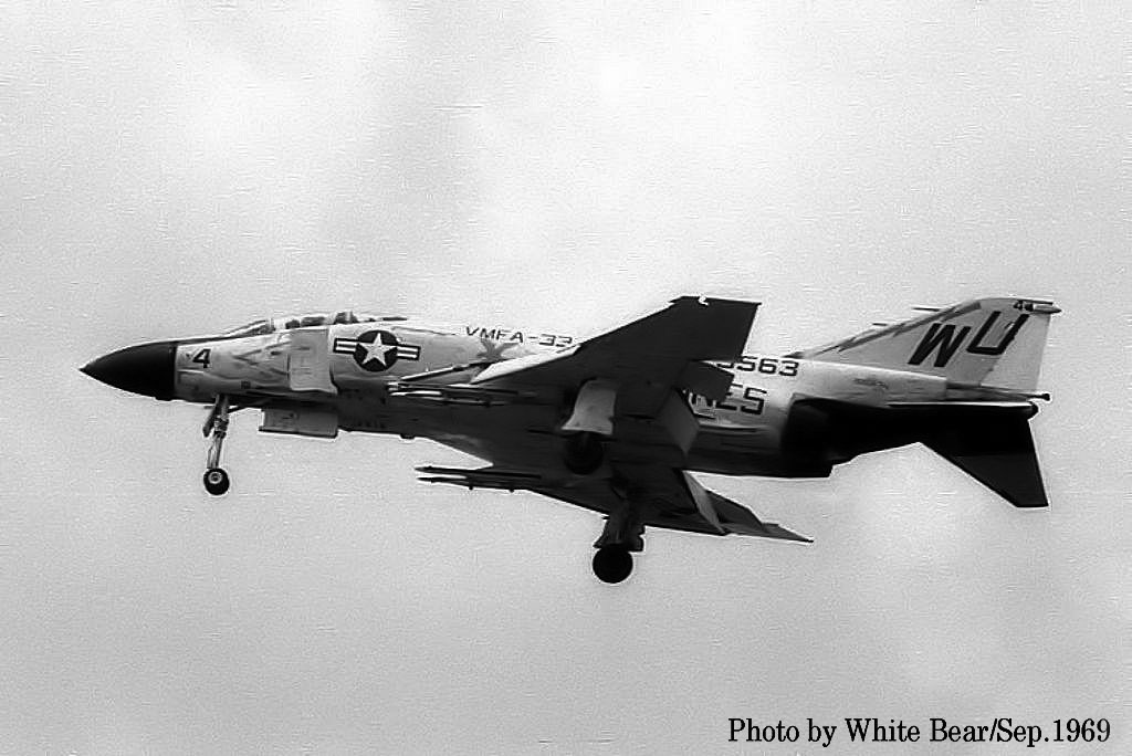 ↑ 岩国基地R/W-20に着陸するVMFA-334のF-4J/WU-4。1969年6月南ベトナムチュンライ基地から戻ってきた部隊は岩国に駐在が決まり、久々に平和を満喫出来たのではないだろうか。この機体は現在でもフロリダ州タイタスビルのバリアント・バトルフィールド博物館で展示されている。
