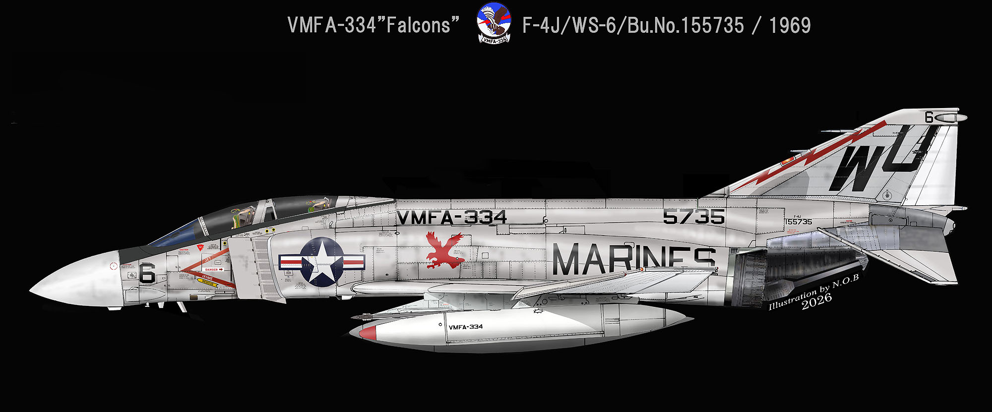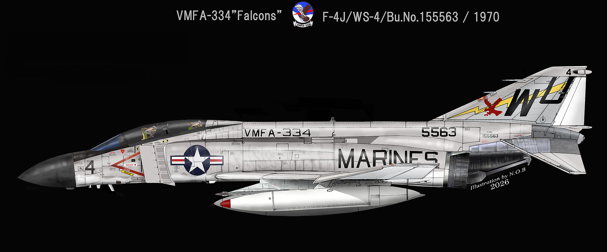 ↑ 1970年写真の先輩和田和也氏が撮影されたVMFA-334の写真を参考に作成したイラストである。ファルコンが尾翼に書かれ、黄色い電光となっているマーキングは非常に珍しく海外のSNSでも取り上げられている写真。背中の部隊ナンバーは海兵隊の表示同様細字である。F-4J/WU-4/Bu.No.155563