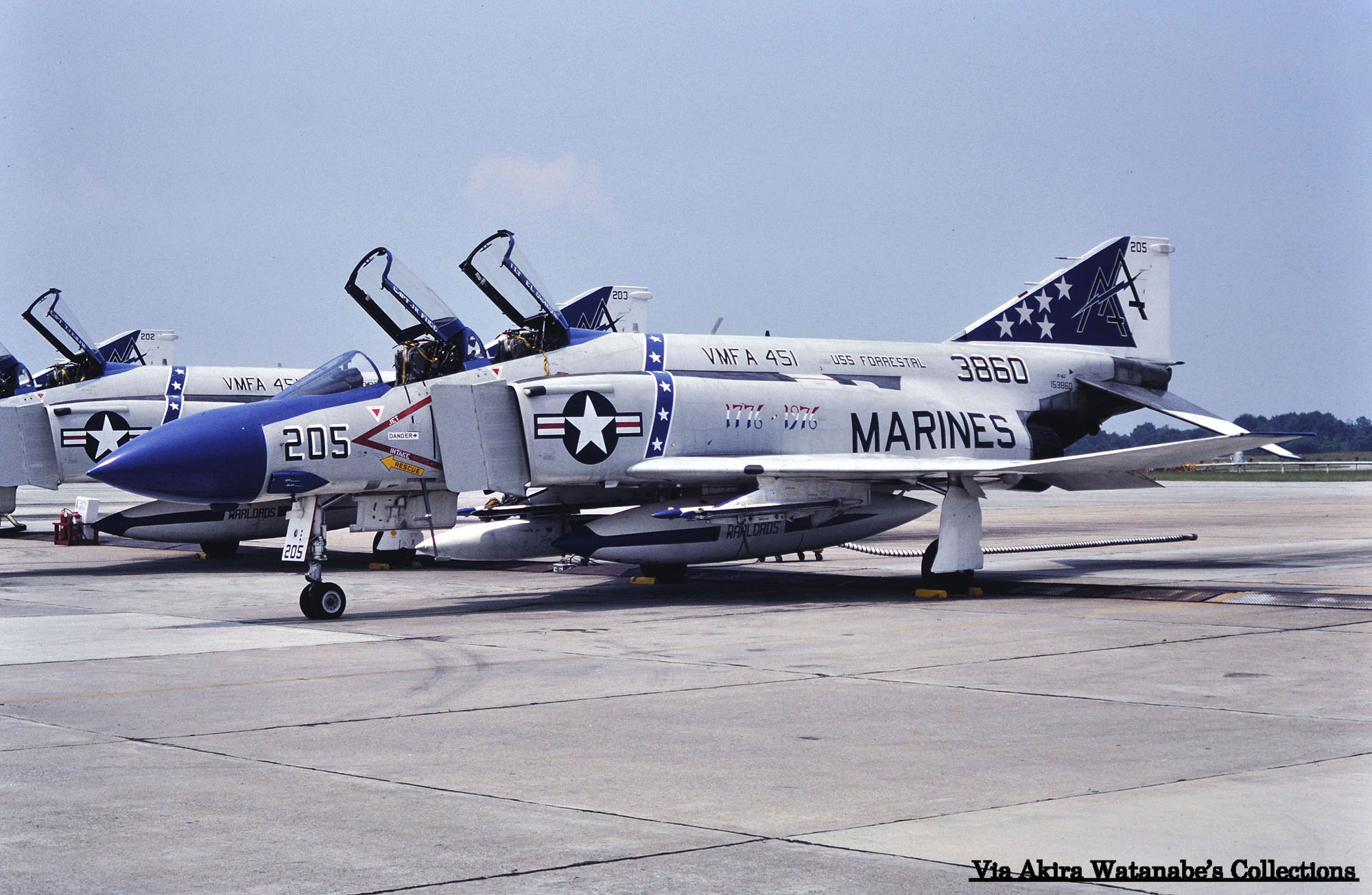 ↑ 1976年7月ビューフォート海兵隊基地で撮影されたVMFA-451のF-4J。胴体には"1776-1976"とトリコロールで書かれており、この年がアメリカ建国200周年に当たる記念マーキングである事が判る。レードームまでマリンブルーに塗るなど派手すぎる出で立ちだ。この時期同飛行隊は、空母フォレスタルに搭載されて訓練航海に出ており、テールコードはVMではなく、CVW-17の所属を示す"AA"が使われた。しかし、予定されていた地中海方面の航海は中止された。