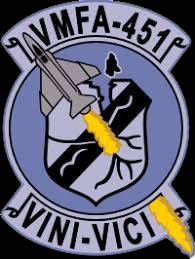 海兵隊第451戦闘機中隊は、その前身が1943年にカルフォフニア州のモハーベで誕生している。当時VMF-451と名付けられたこの飛行隊はニックネームが”ブルーデビルス”だった為、スコードロンカラは青。日本軍にもそのタフな事で恐れられたF4U-1コルセア戦闘機を擁して、USSバンカーヒルで太平洋戦線に向かう。この時の空母バンカーヒルの3個戦闘機中隊は全てF4U-1コルセアで統一された”ウルフギャング”と呼ばれた強力部隊だった。彼らは日本の九州地方を急襲するなど大暴れしたが、ご存知の通りバンカーヒルは、日本の菊水隊の特別攻撃を受け、沈没寸前の被害を受けたので、同隊も甲板/格納庫で壊滅的損害を受けて、終戦の1945年に解体されている。1946年に再結成され予備役部隊として存在していたが、1951年現役部隊として復活、1954年にジェット戦闘機のFLフューリーを受領した際に、現在のニックネーム”ウォーローズ”を採用した。本拠地は当時エルトロで、ここで新型のF8U-2クルセイダー戦闘機に更新、1962年には日本の厚木基地に展開した事もあった。F-4Jファントムに更新したのは1968年で、この時にVMFA-451と改名、本拠地もノースカロライナ州のビューフォートへ移動した。