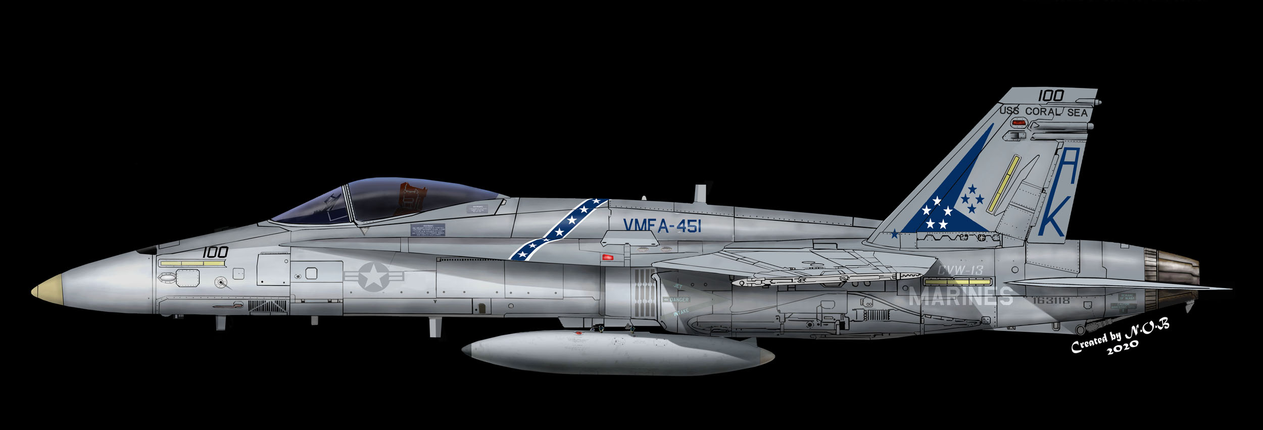 ↑ 1989年空母コーラルシー最後の航海でCVW-13に配属され、遠征に出た際のVMFA-451 AK-100F/A-18A.Bu.No.163118。この年空母コーラルシーは5月末から9月までの約4か月間地中海方面で最後の活動をして役目を終えた。それと同時にレーガン政権時代に生まれた空母航空団CVW-13(AK)もブッシュ政権の財政圧縮策の中、部隊解散となった。