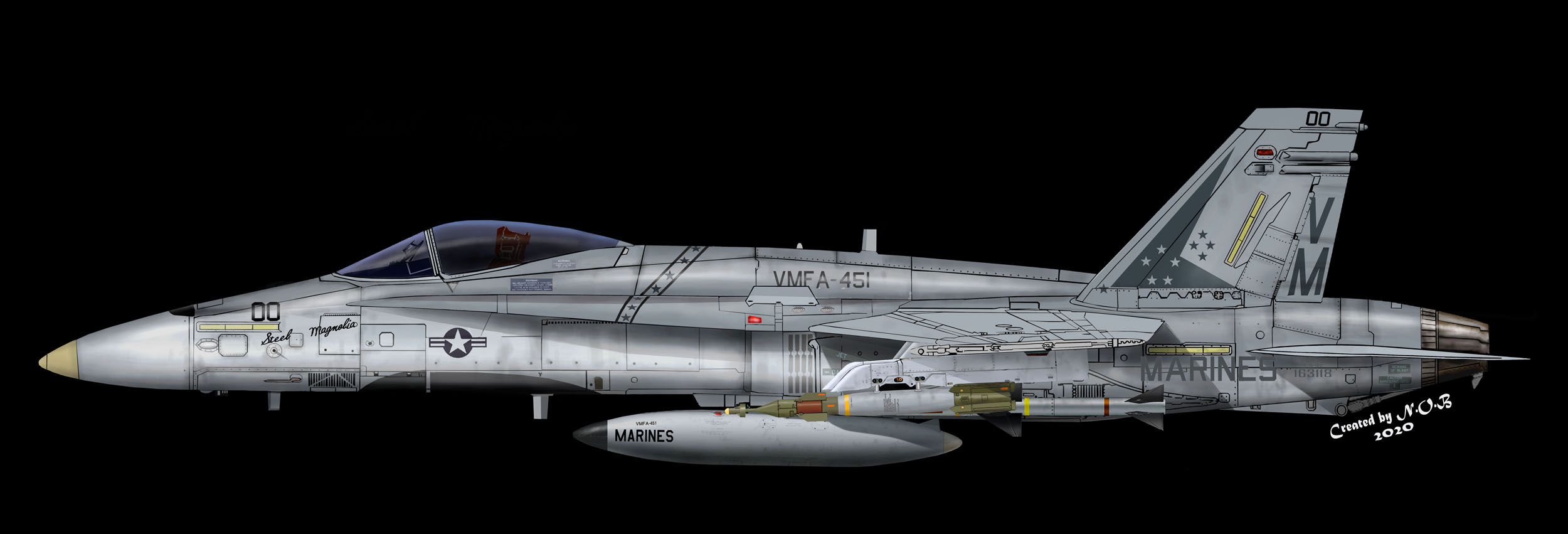 ↑ 19912月砂漠の嵐作戦から帰隊したVMFA-451の司令官指定機 機首には、「Steel Magnolia」と愛機のニックネームとも読めるものが黒文字で入っている。尾翼の星は部隊番号にちなんで4.5.1個の配列。F/A-18A VW-00 Bu.No.163118
