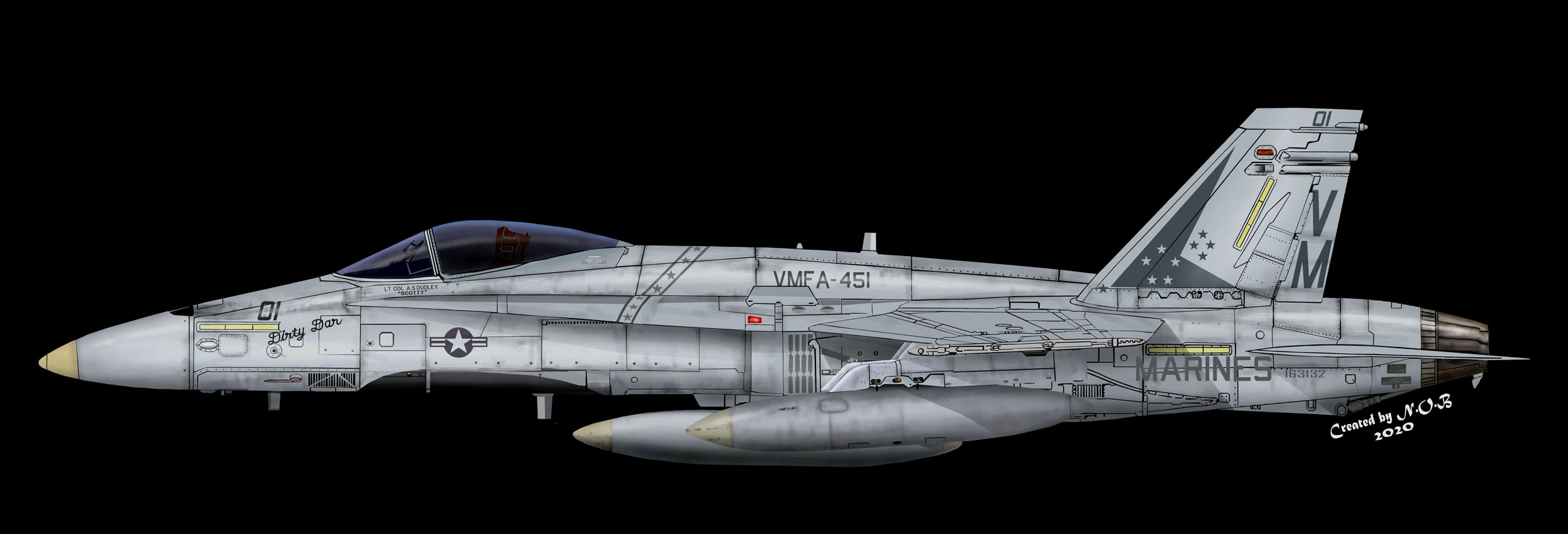 ↑ 19912月イラクの砂漠の嵐作戦から帰隊した時のマーキング。VMFA-451の部隊長ダットリー中佐が自ら操縦していた機体。機首の左右に斜めに「Dirty Dar」と黒文字で書かれてあった。F/A-18A  VW-01 Bu.No.163132