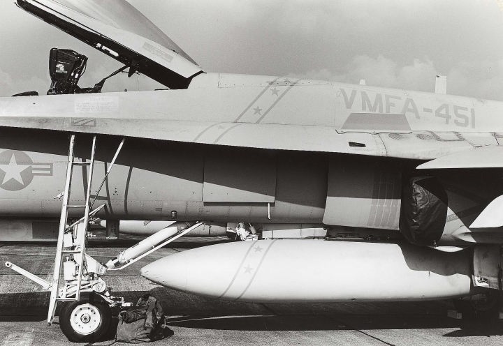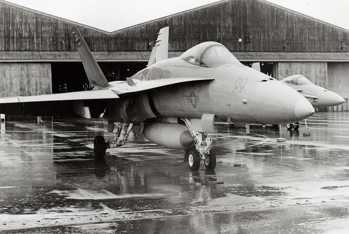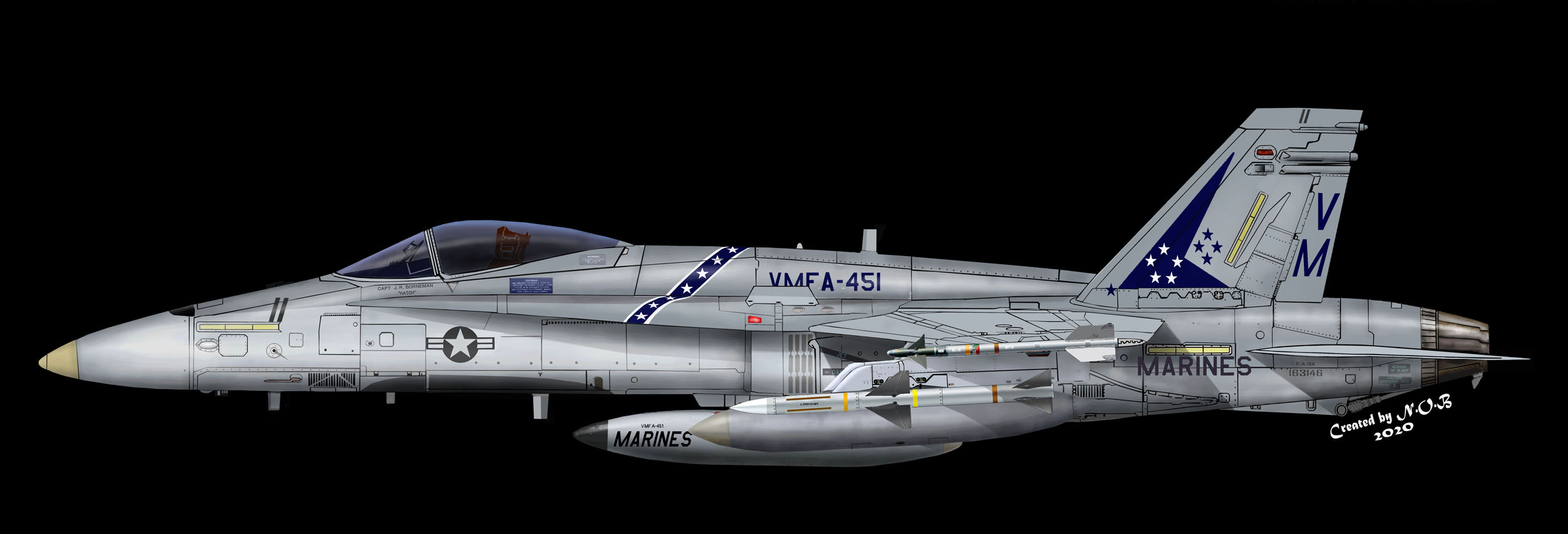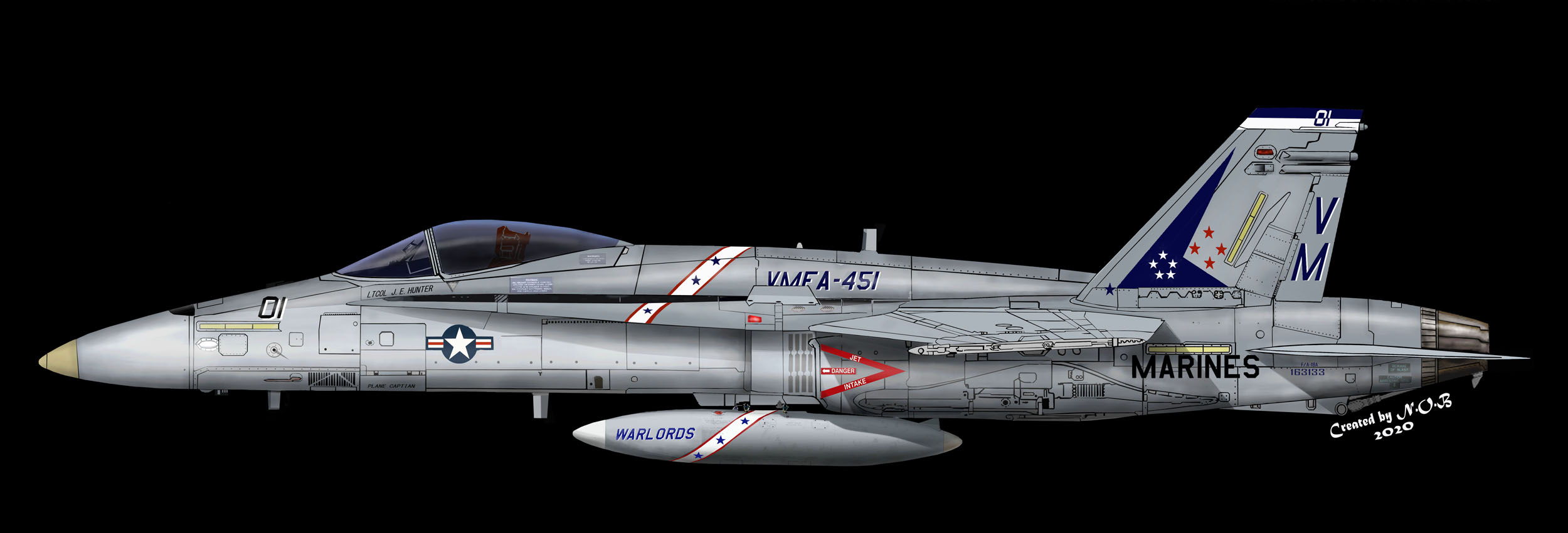 ↑ 1991年の湾岸戦争時、スコードロンカラーでマーキングされていたVW-11。機首下面には、フォルスキャノピーも描かれ実戦向きマーキング。胴体上面のブルーの帯には、左右合計で16個の★が書かれている。F/A-18A VW-00 Bu.No.163164