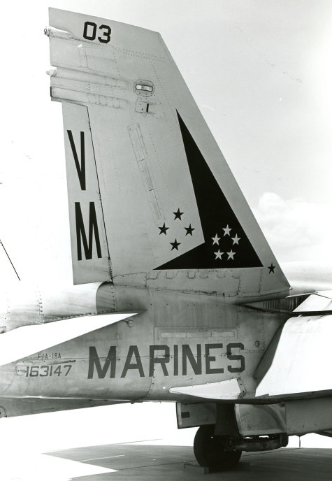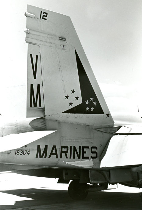 ↑ 1996年頃フルカラーマーキングとして各地で宣伝に使われた機体。同年鹿屋基地の航空祭にもVW-11とともに参加している。但し日本で撮影されたもの以外は、尾翼にビューフォート・マリンを表す「BM」と書かれた写真が多い。センタータンクに「Warlords」と書かれていたのもこの期間である。帯が従来と異なり白帯に青★で赤の淵がある。帯の★は、9個。F/A-18A VW-00 Bu.No.163133