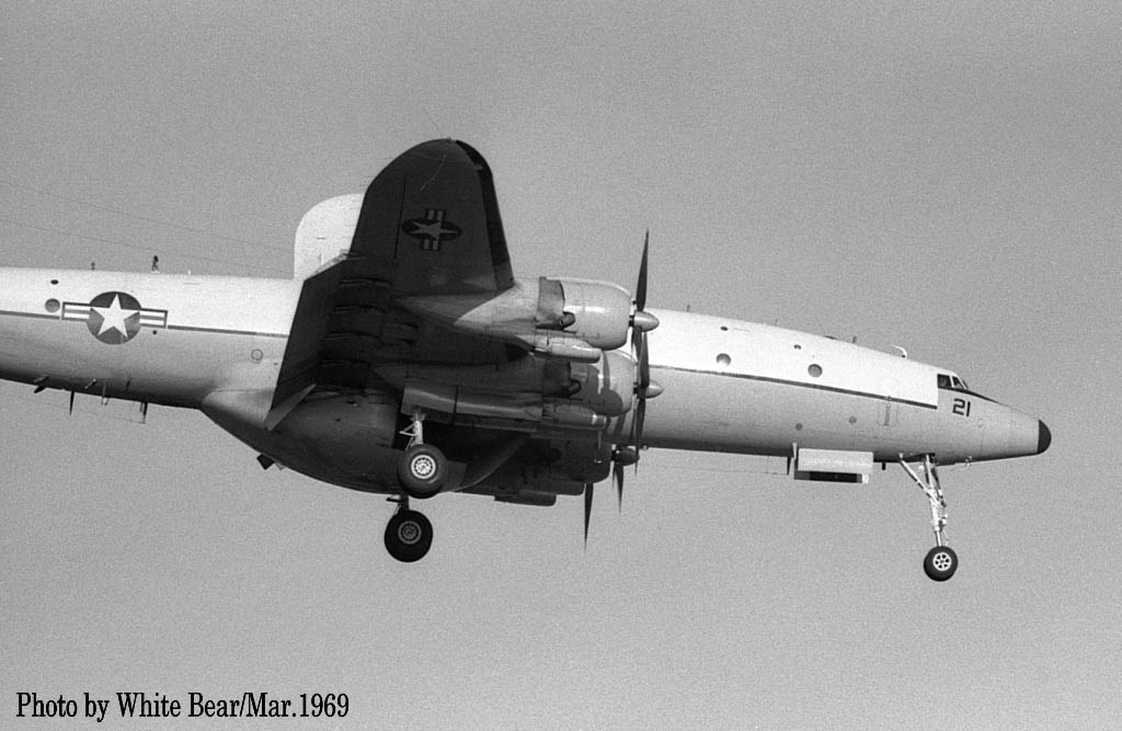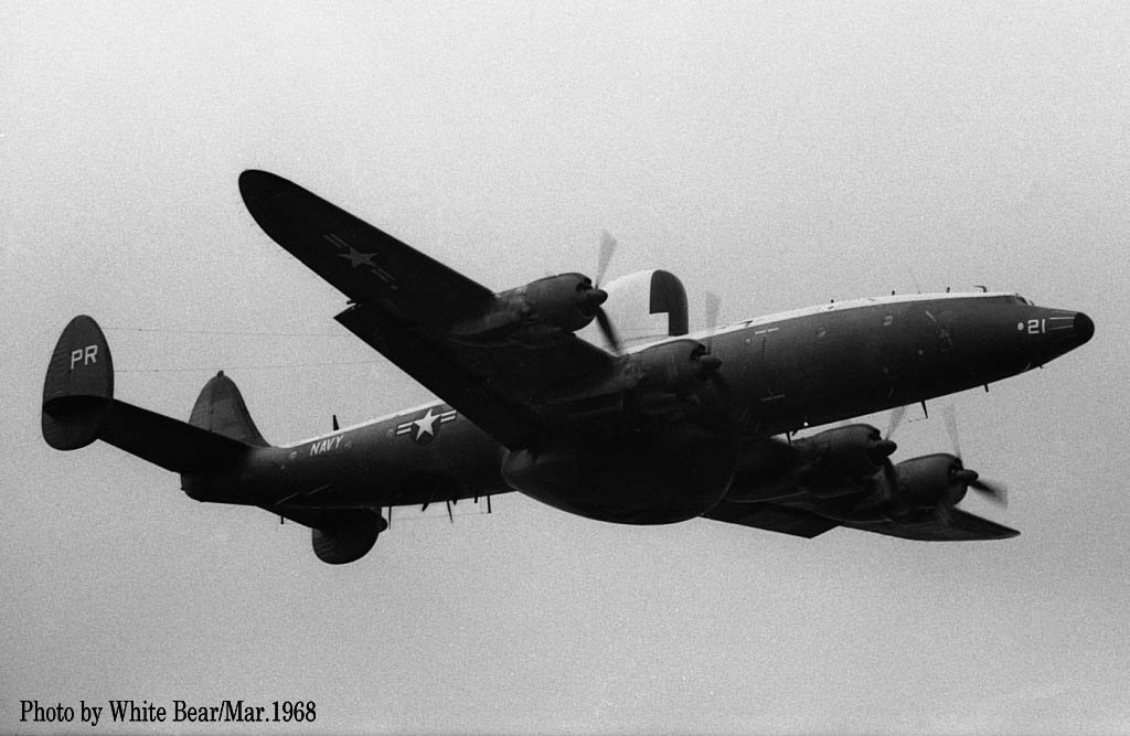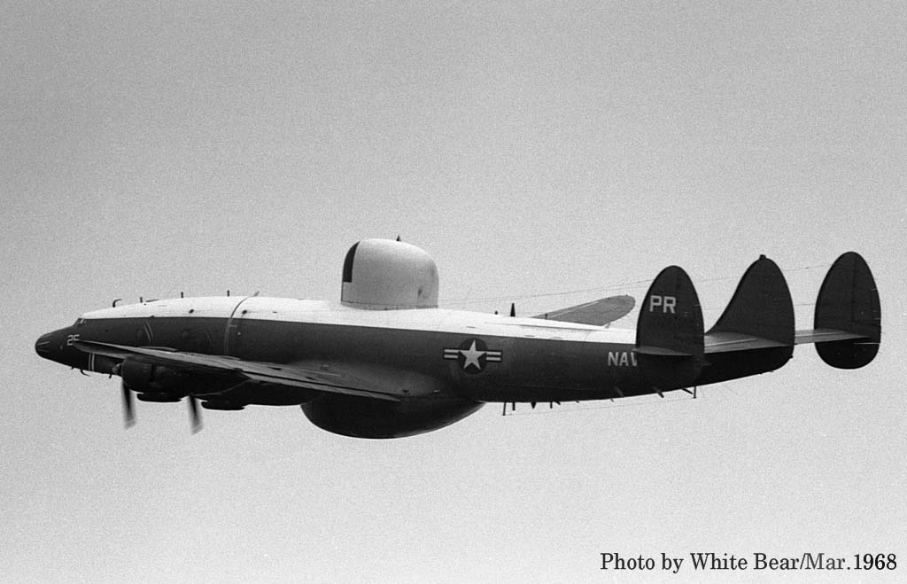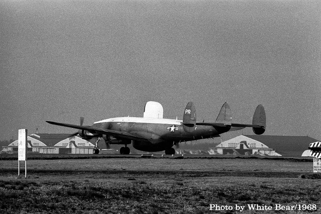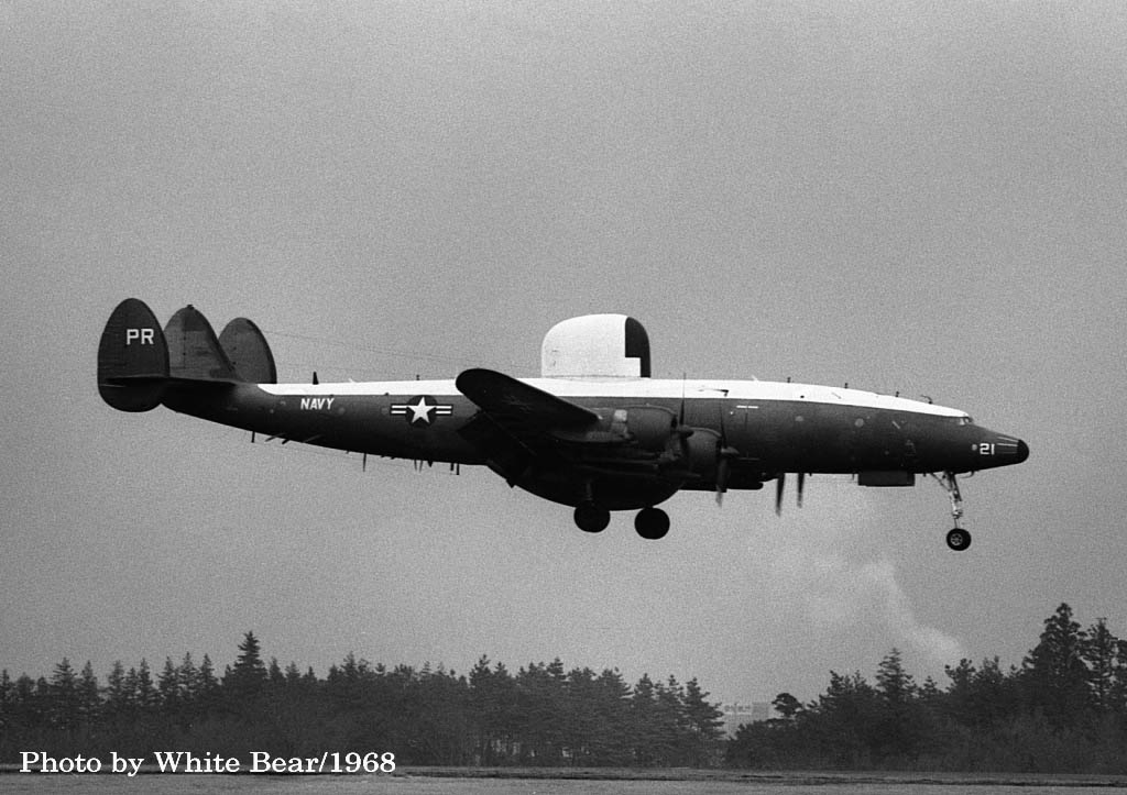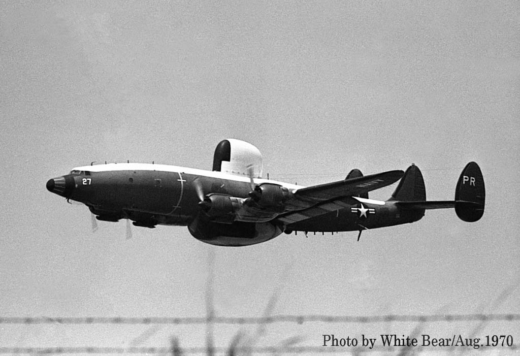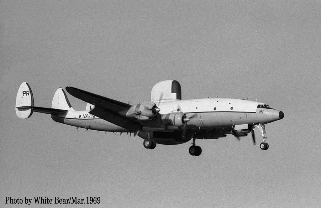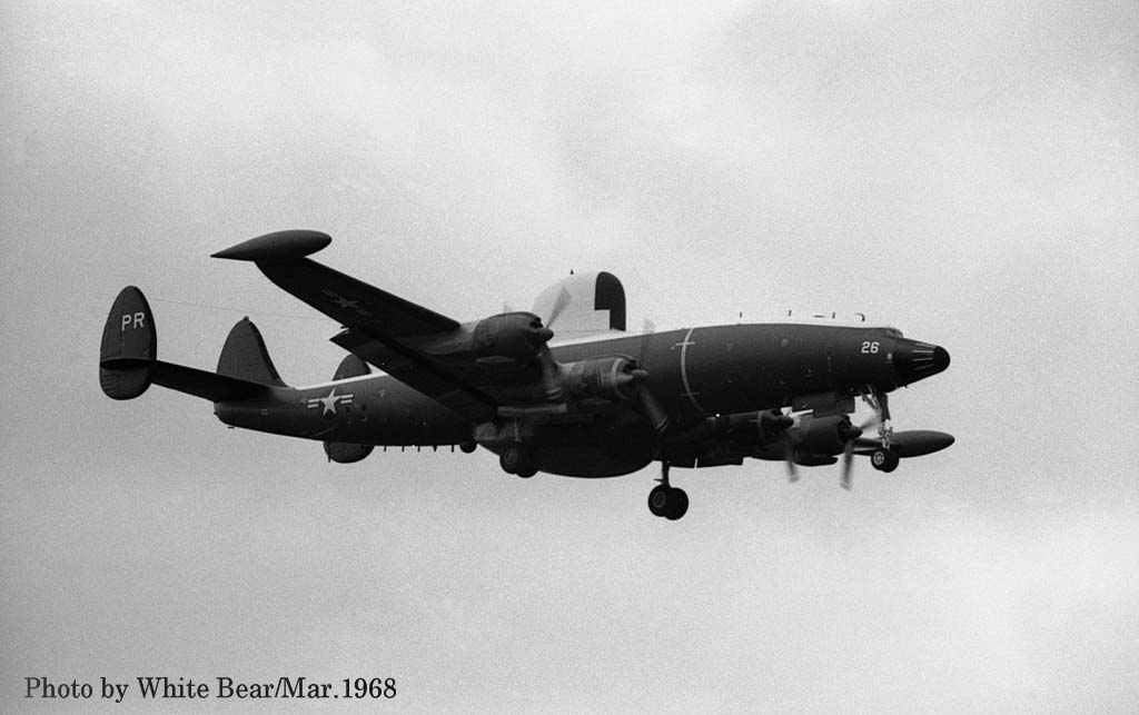 ↑ 1967年3月 厚木基地で撮影されたEC-121M/PR-26/Bu.No.145927。White Bearさんによれば、この時が初飛来だそうで、主翼のチップタンクを付けていた。1970年3月16日台湾の台南市からベトナムのダナンに帰投時。ダナンのランウェイに進入機を発見し、これをかわそうとして失敗、格納庫やF-4D等と激突して失われた。