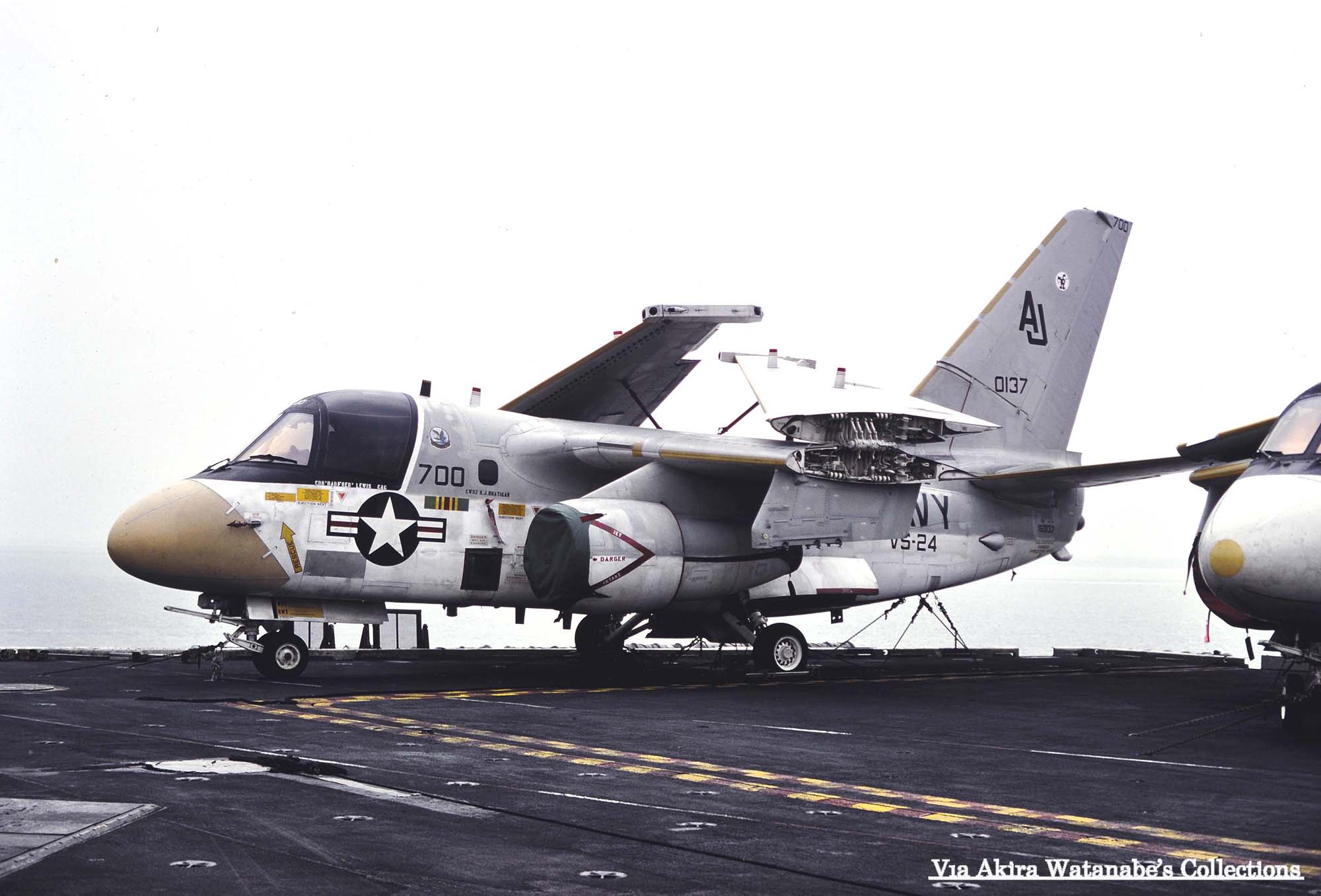 ↑ 1980年4月空母ニミッツ艦上で撮影されたVS-24のS-3B/AJ-700。1979年9月から1980年5月までの間は、空母ニミッツでの2回目の航海遠征に当たる。既に海軍にもロービジの波が来ており、戦闘機部隊も含め従来の派手なマーキングが少ずつ無くなり始めた頃である。