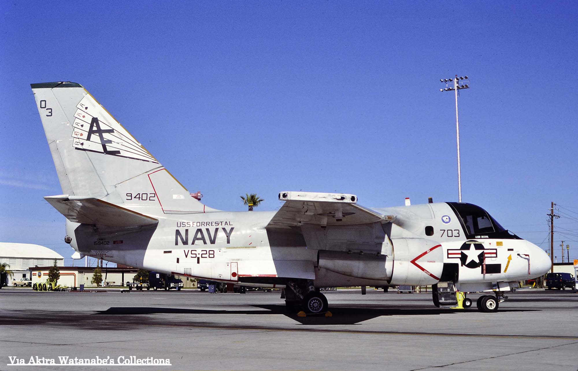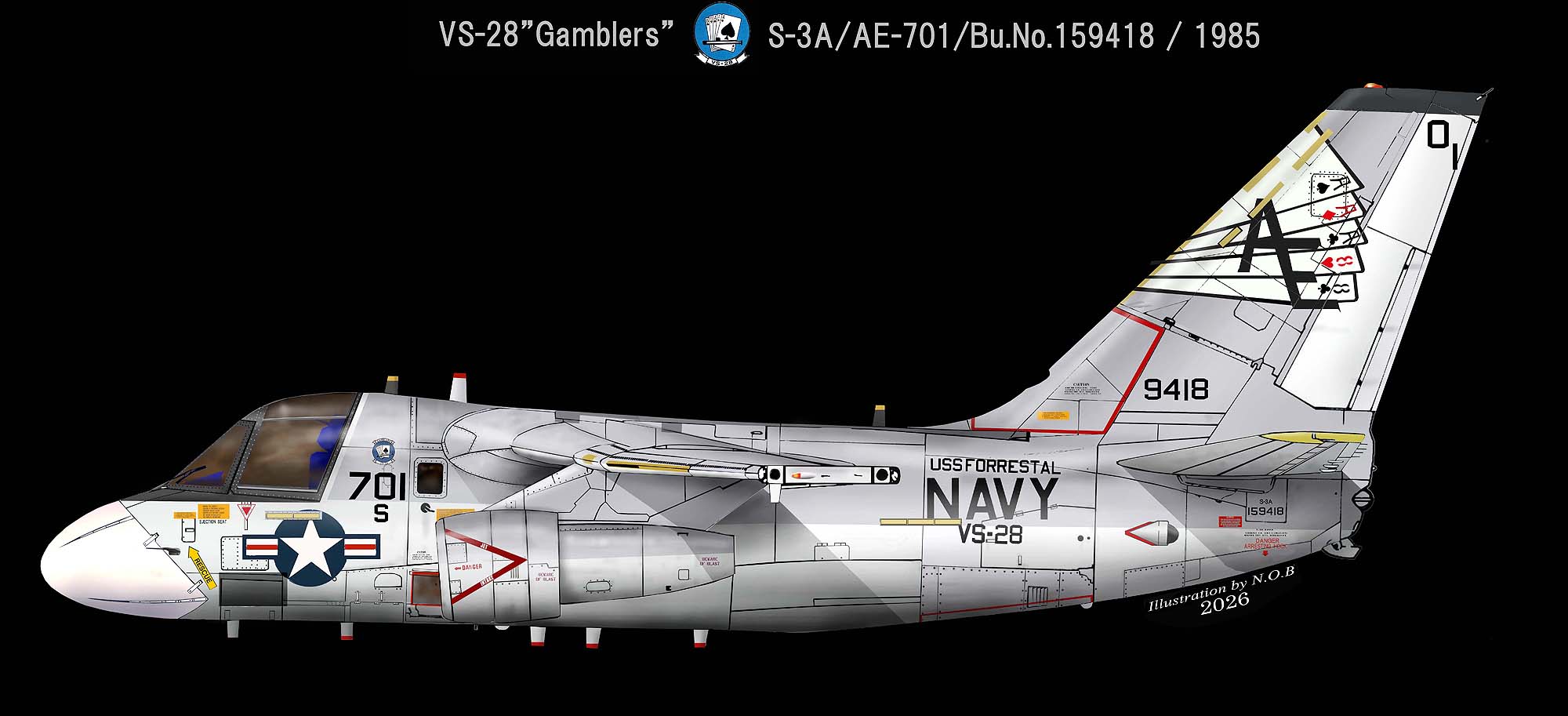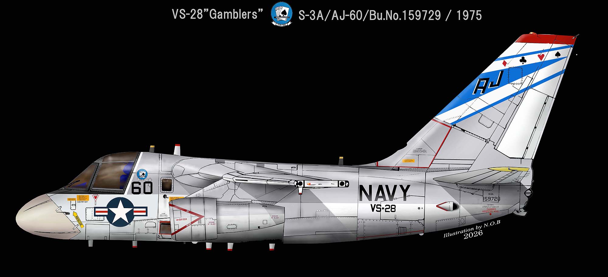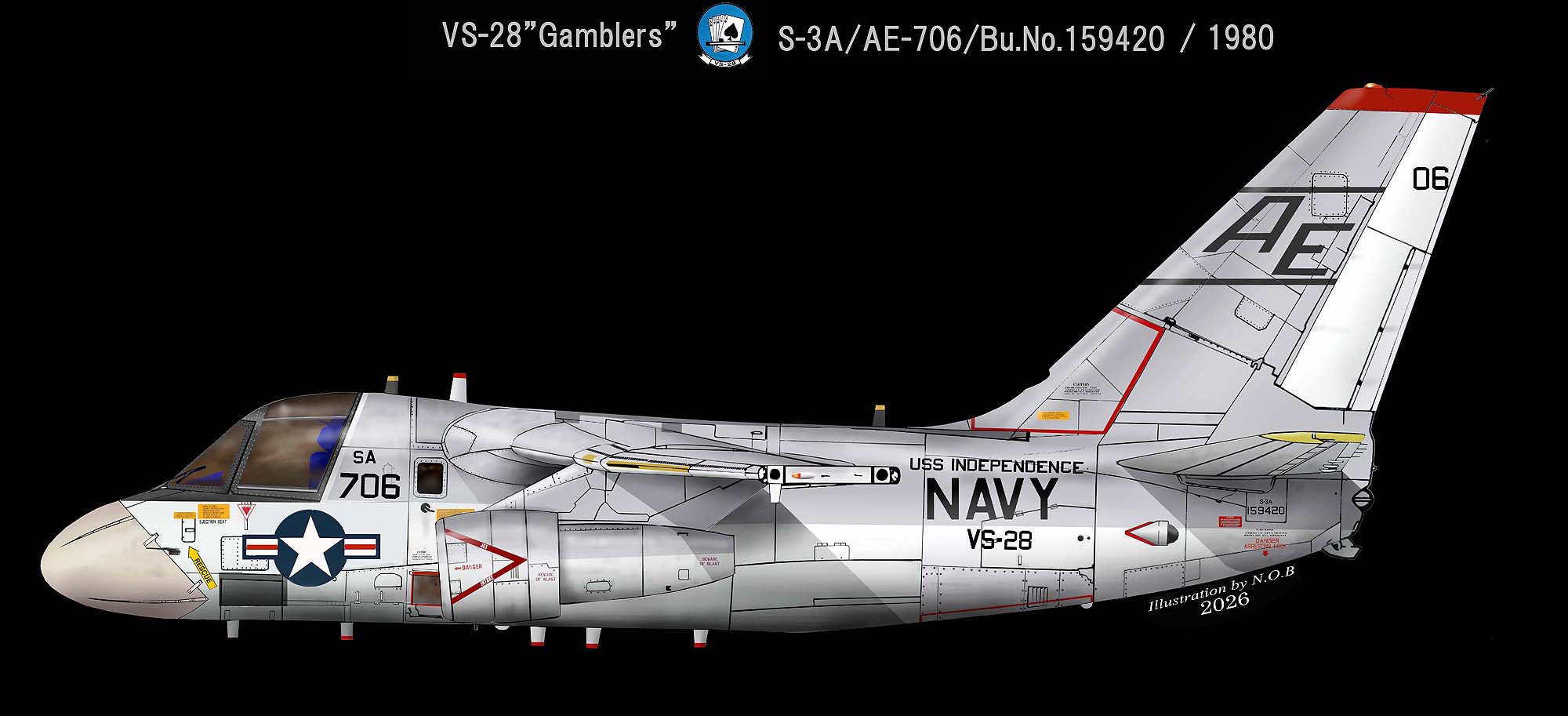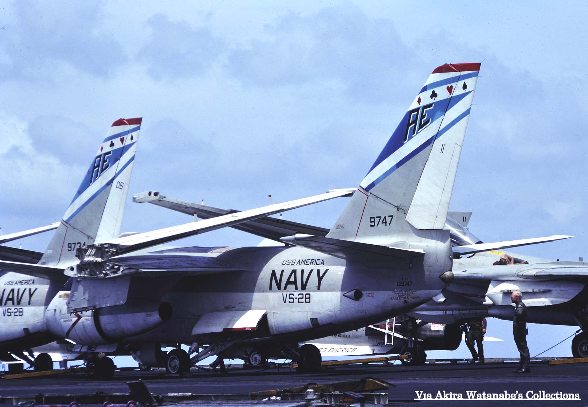 ↑ その後CVW-6の傘下で1979年6月から空母インディペンデンスに搭載された同隊のS-3Aは暫くの間一つ上のイラストと同じ青いトランプのマーキングを維持したが、1980年代のロービジの影響か、上の様な簡易な塗装に変えられた。S-3A/AE-706/Bu.No.159420
